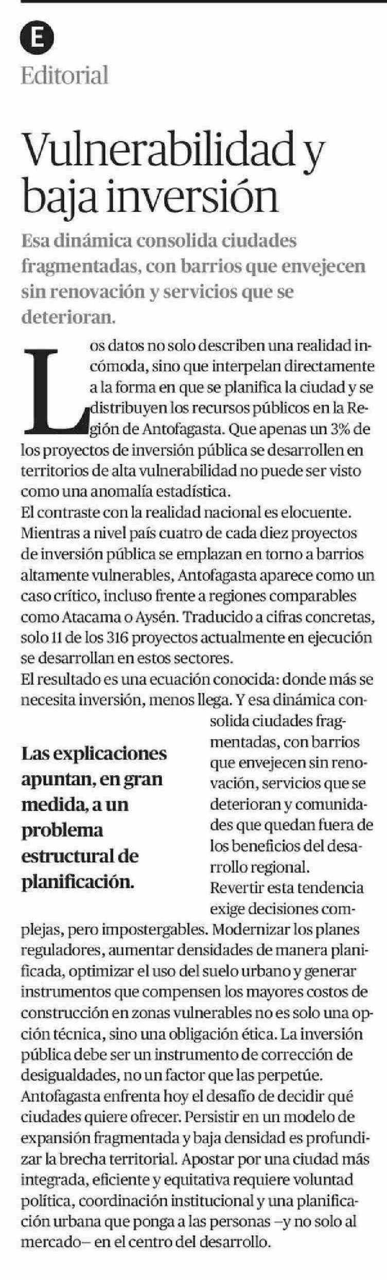Editorial: Vulnerabilidad y baja inversión 09-01-2026 El Mercurio de Calama |