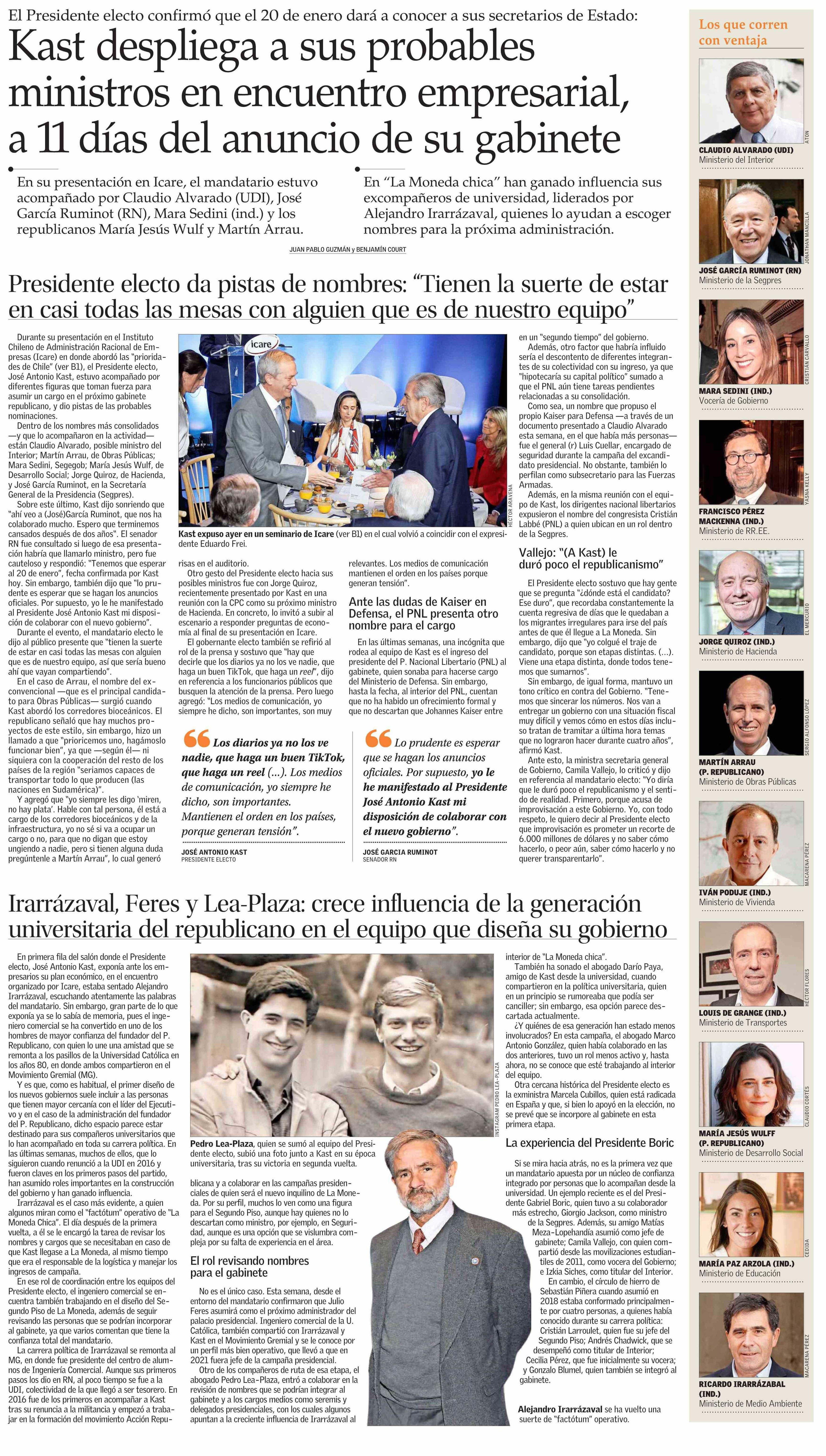 | Título: | Kast despliega a sus probables ministros en encuentro empresarial, a 11 días del anuncio de su gabinete |