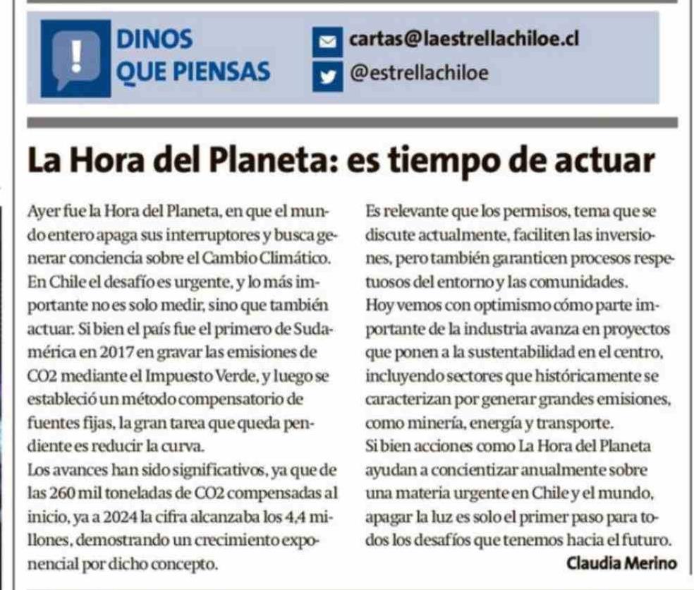 Cartas: La Hora del Planeta: es tiempo de actuar 29-03-2026 La Estrella de Chiloé |