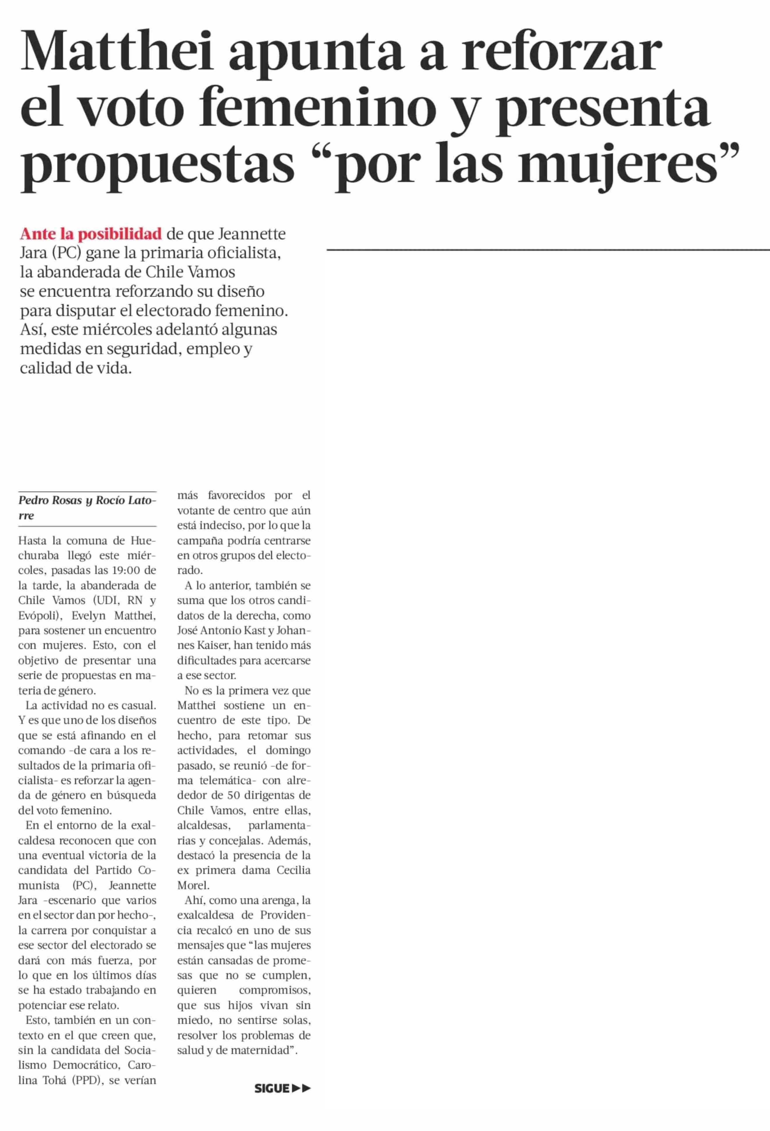Matthei apunta a reforzar el voto femenino y presenta propuestas “por las mujeres” 26-06-2025 La Tercera |