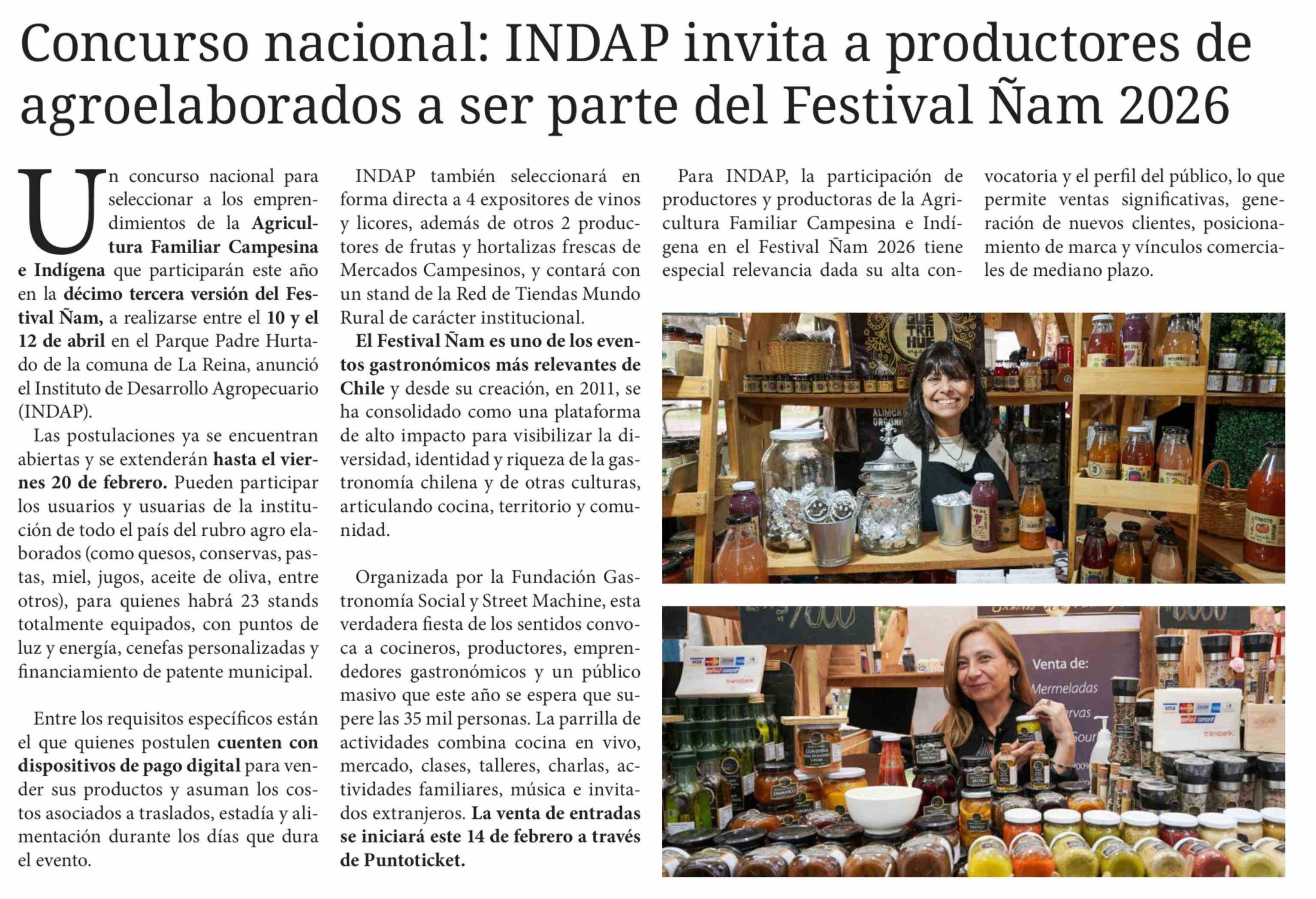 Concurso nacional: INDAP invita a productores de agroelaborados a ser parte del Festival Ñam 2026 15-02-2026 Diario Chañarcillo |