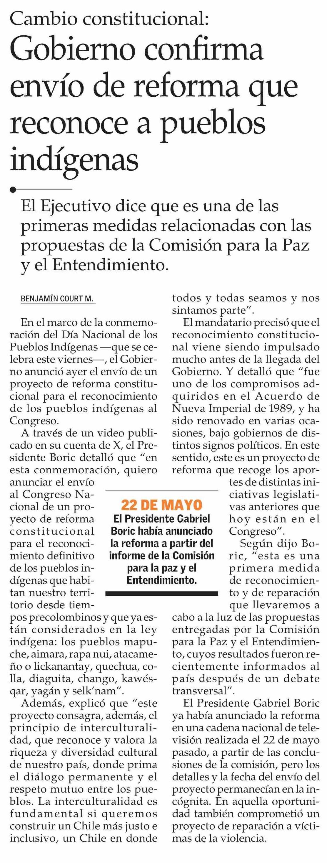 Gobierno confirma envío de reforma que reconoce a pueblos indígenas 20-06-2025 El Mercurio |