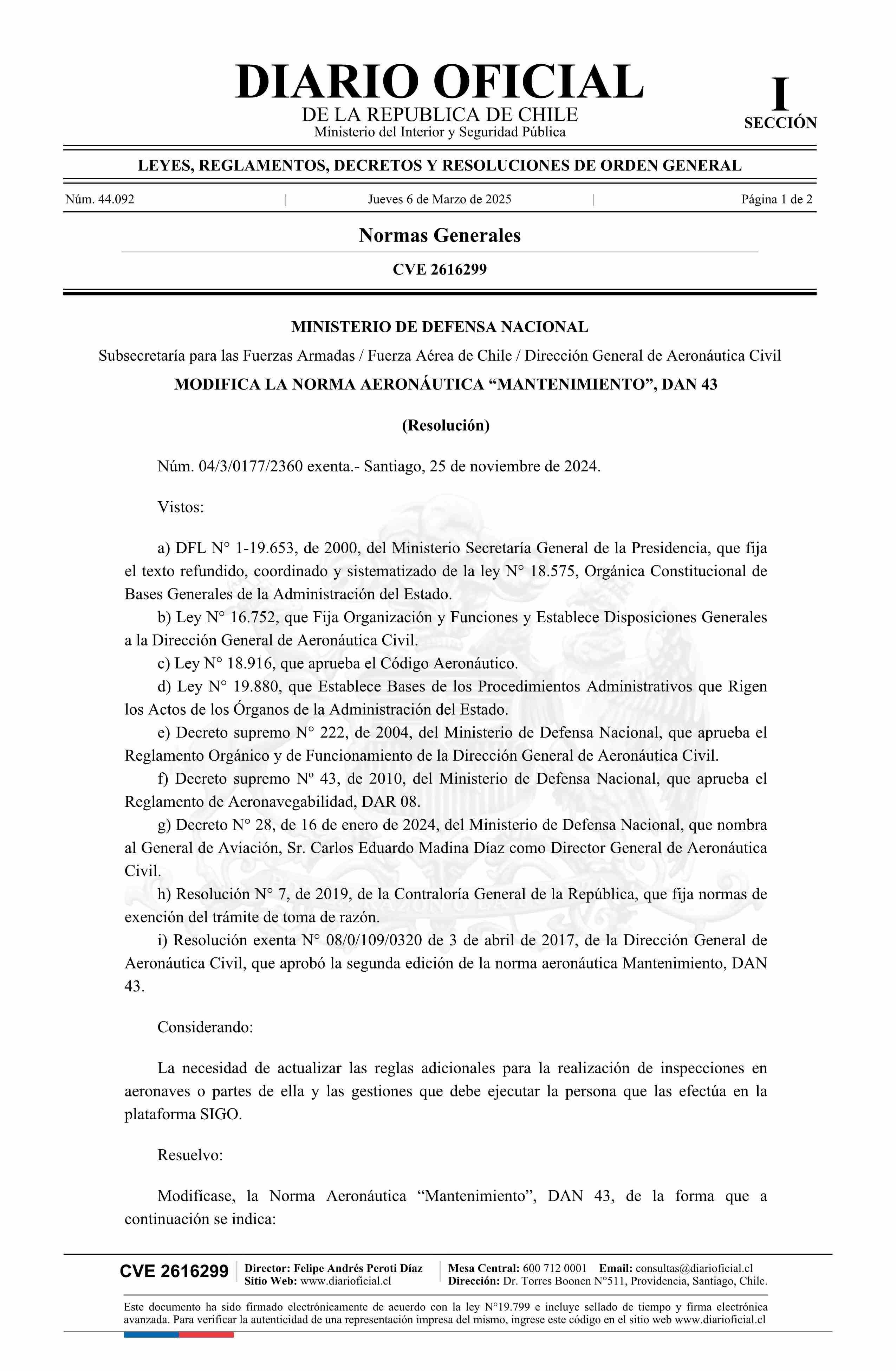 Resolución exenta número 04/3/0177/2360, de 2024.- Modifica la Norma Aeronáutica Mantenimiento, DAN 43 06-03-2025 Diario Oficial Edición Electrónica |