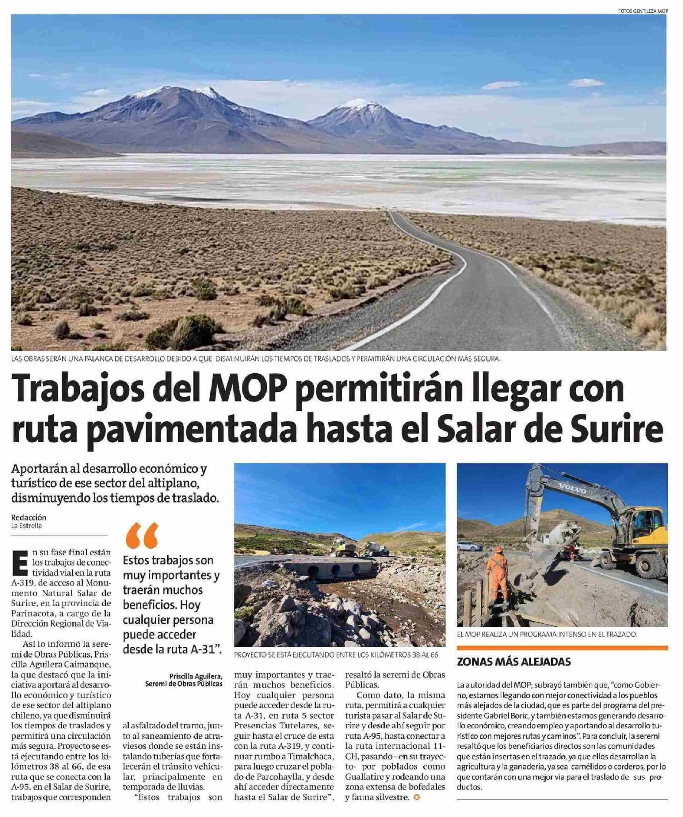 Trabajos del MOP permitirán llegar con ruta pavimentada hasta el Salar de Surire 03-06-2025 La Estrella de Arica |
