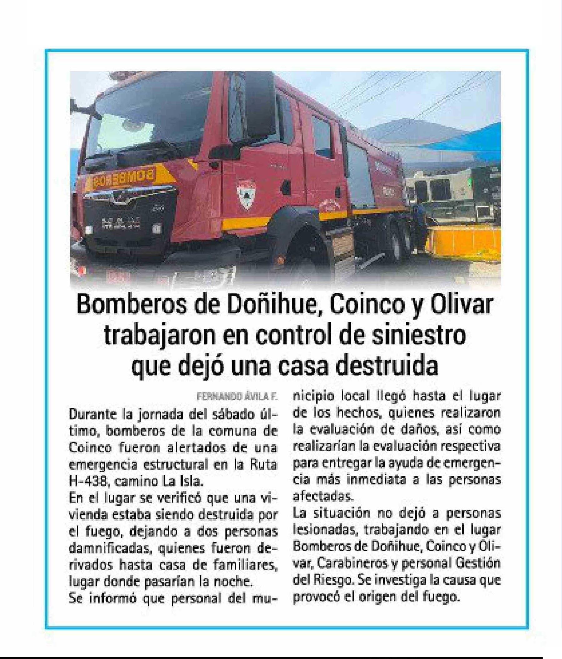 | Título: | Bomberos de Doñihue, Coinco y Olivé trabajaron en control de siniestro que dejó una casa destruida |