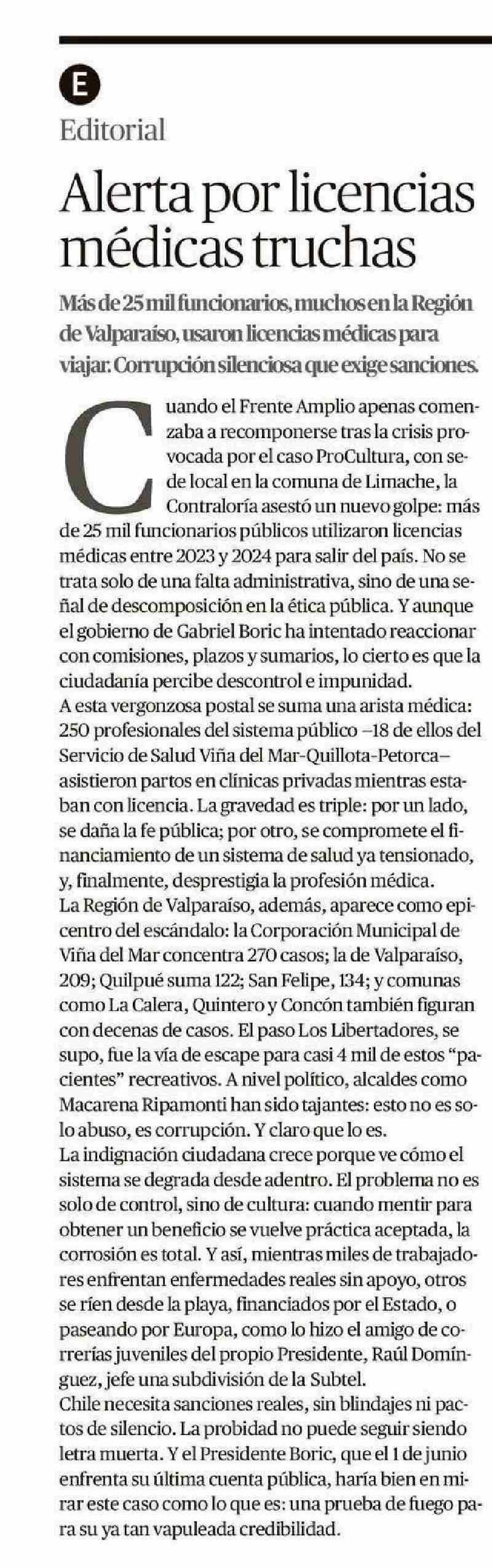 EDITORIAL: Alerta por licencias médicas truchas 25-05-2025 El Mercurio de Valparaíso |