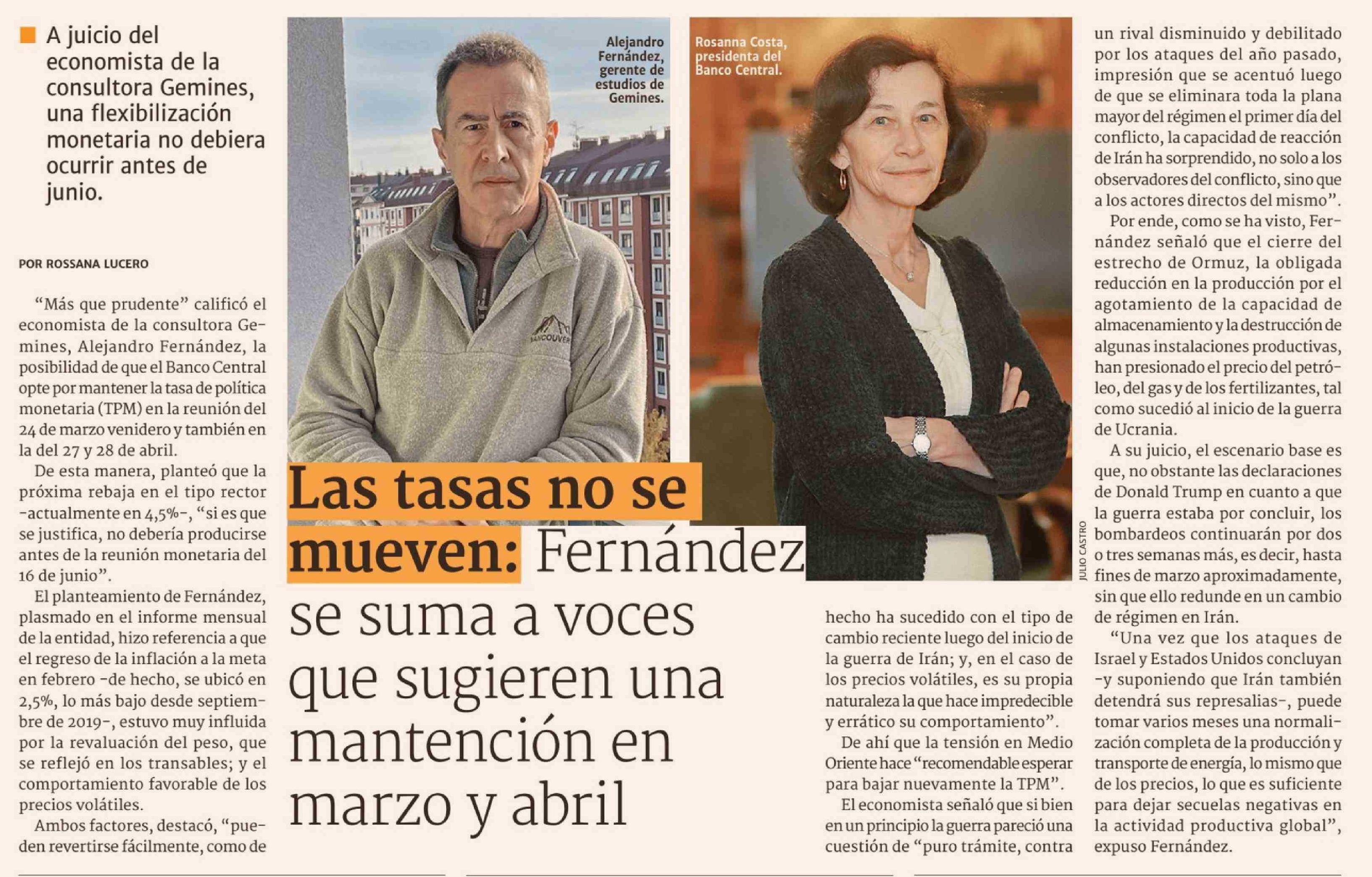 Las tasas no se mueven: Fernández se suma a voces que sugieren una mantención en marzo y abril 16-03-2026 Diario Financiero |