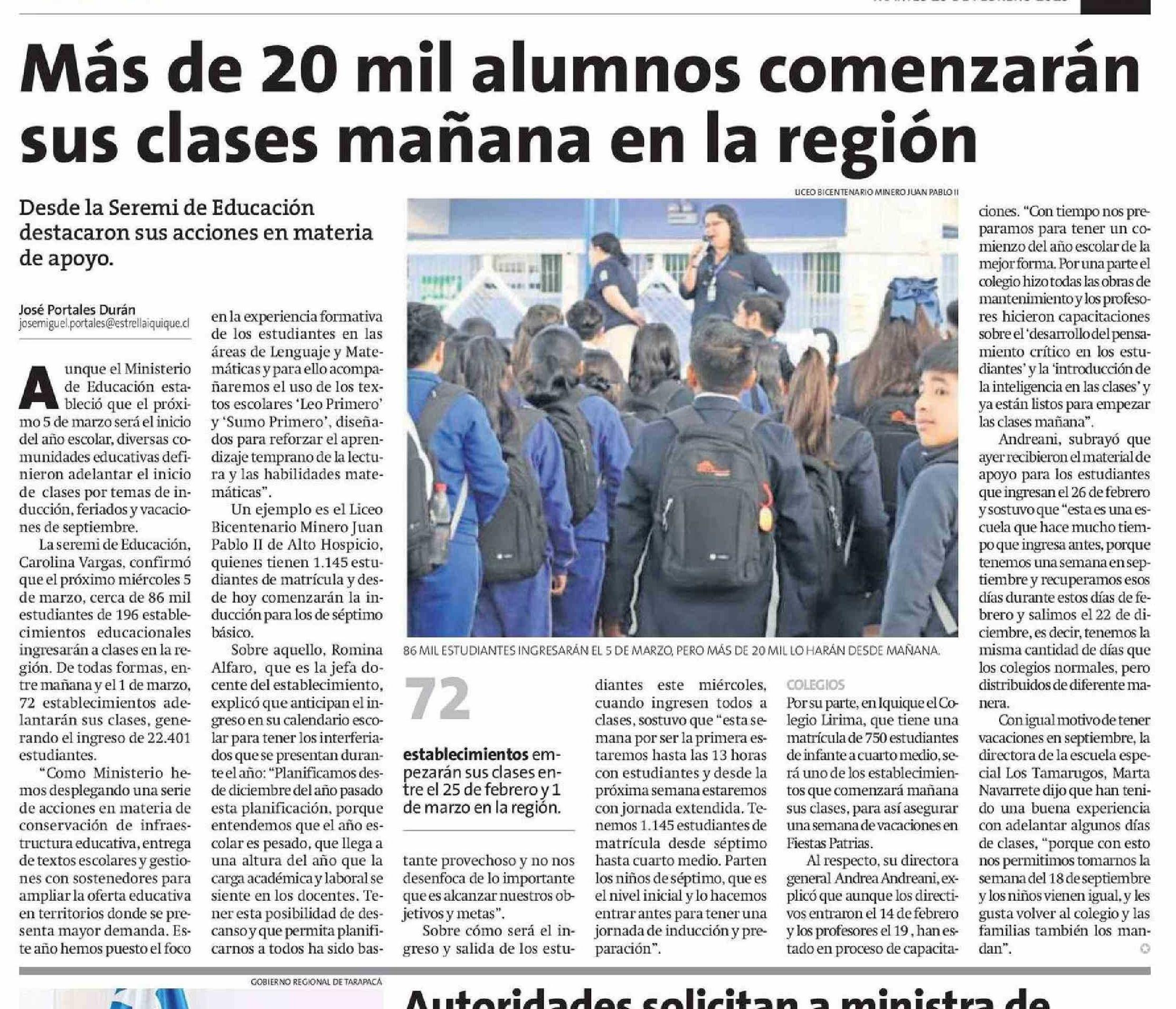 Más de 20 mil alumnos comenzarán sus clases mañana en la región 25-02-2025 La Estrella de Iquique |