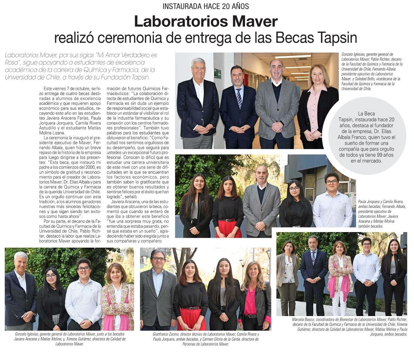 Laboratorios Maver realizó ceremonia de entrega de las Becas Tapsin 09-10-2022 El Mercurio |