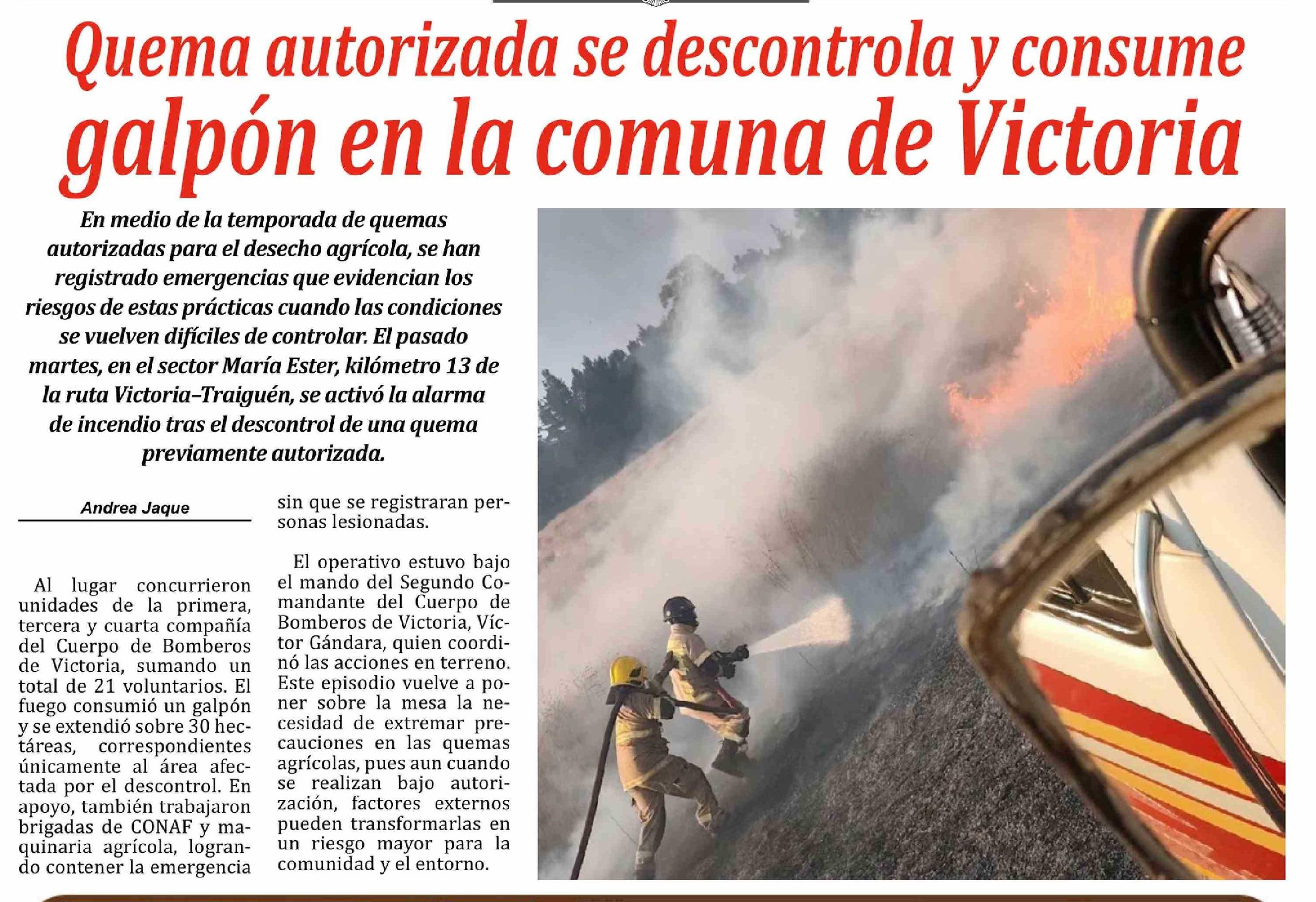 | Título: | Quema autorizada se descontrola y consume galpón en la comuna de Victoria |