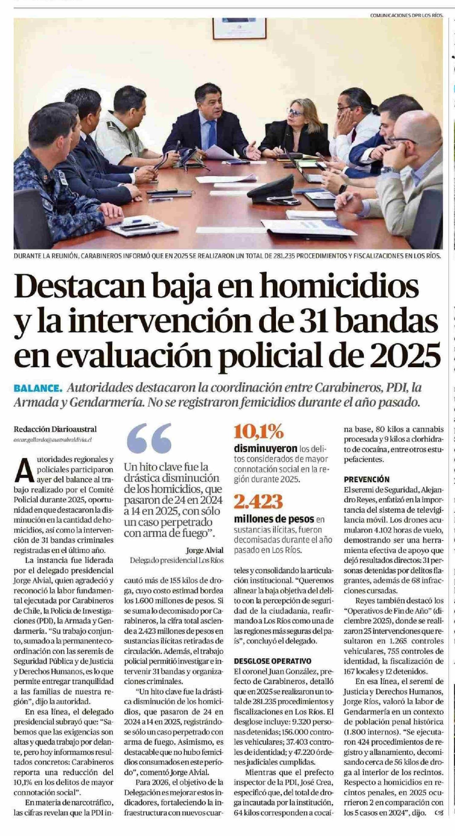 Destacan baja en homicidios y la intervención de 31 bandas en evaluación policial de 2025 07-01-2026 Diario Austral Región de Los Ríos |
