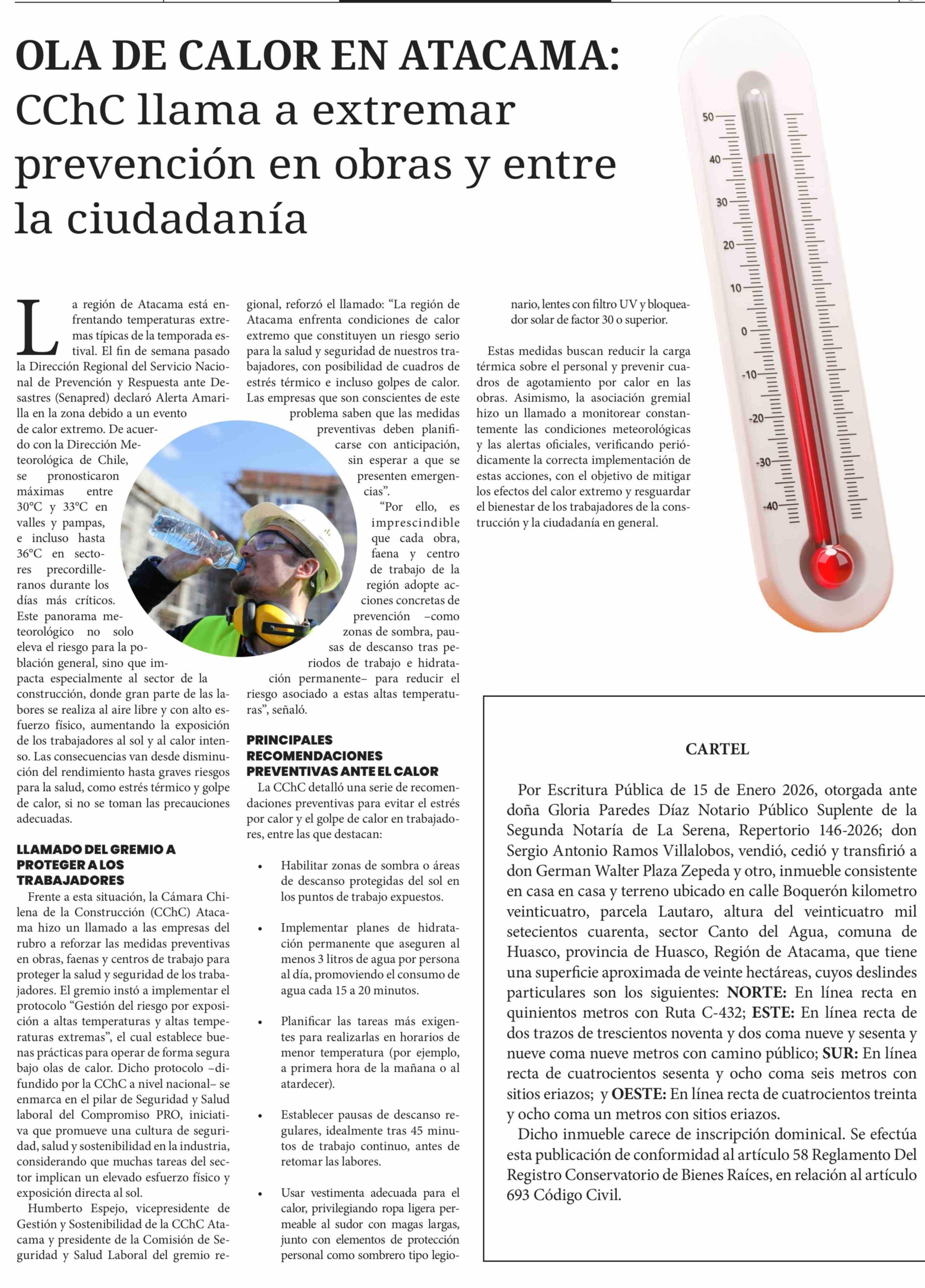 OLA DE CALOR EN ATACAMA: CChC llama a extremar prevención en obras y entre la ciudadanía 13-02-2026 Diario Chañarcillo |