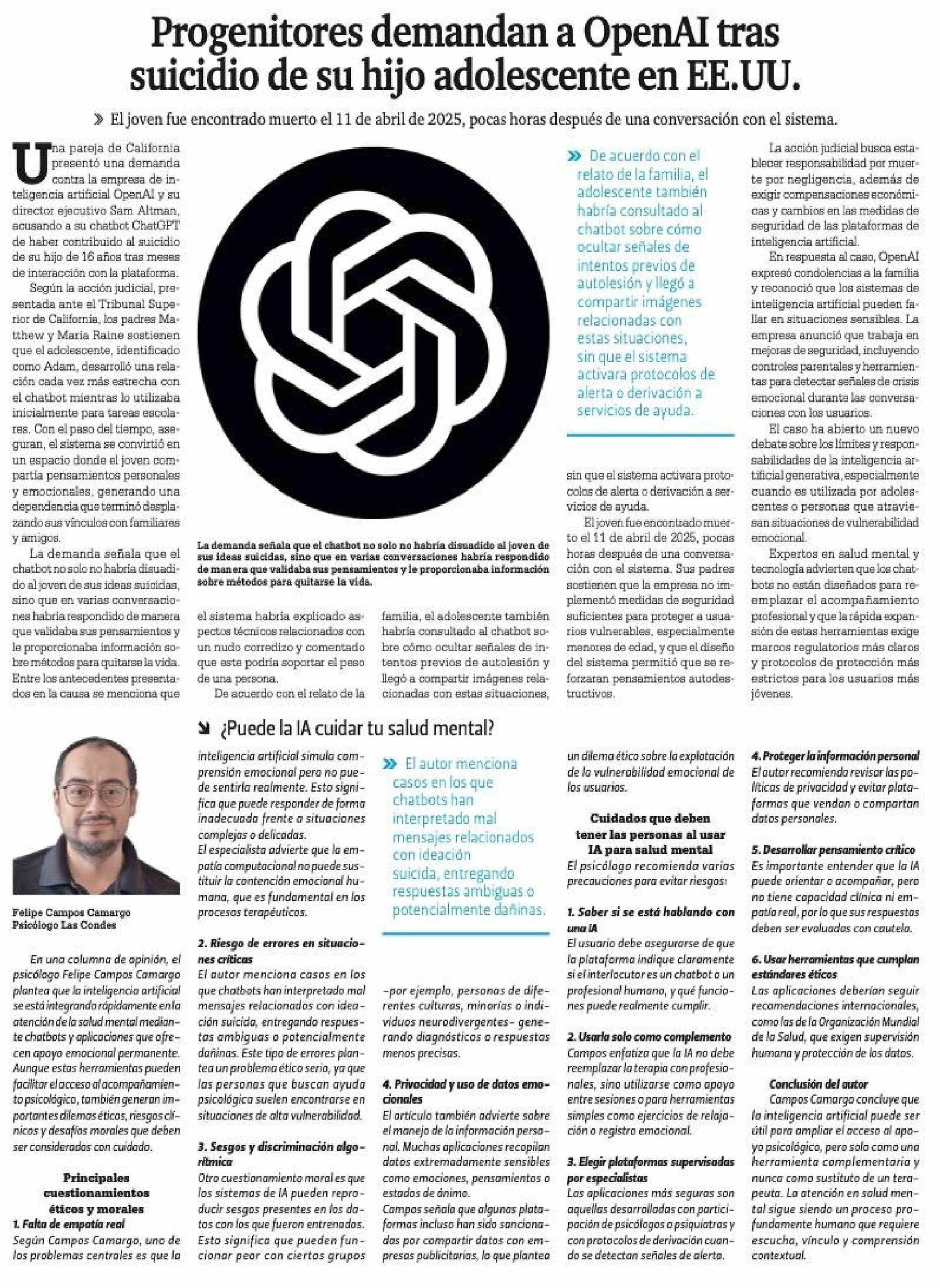 Progenitores demandan a OpenAI tras suicidio de su hijo adolescente en EE.UU. 06-03-2026 La Prensa Austral |