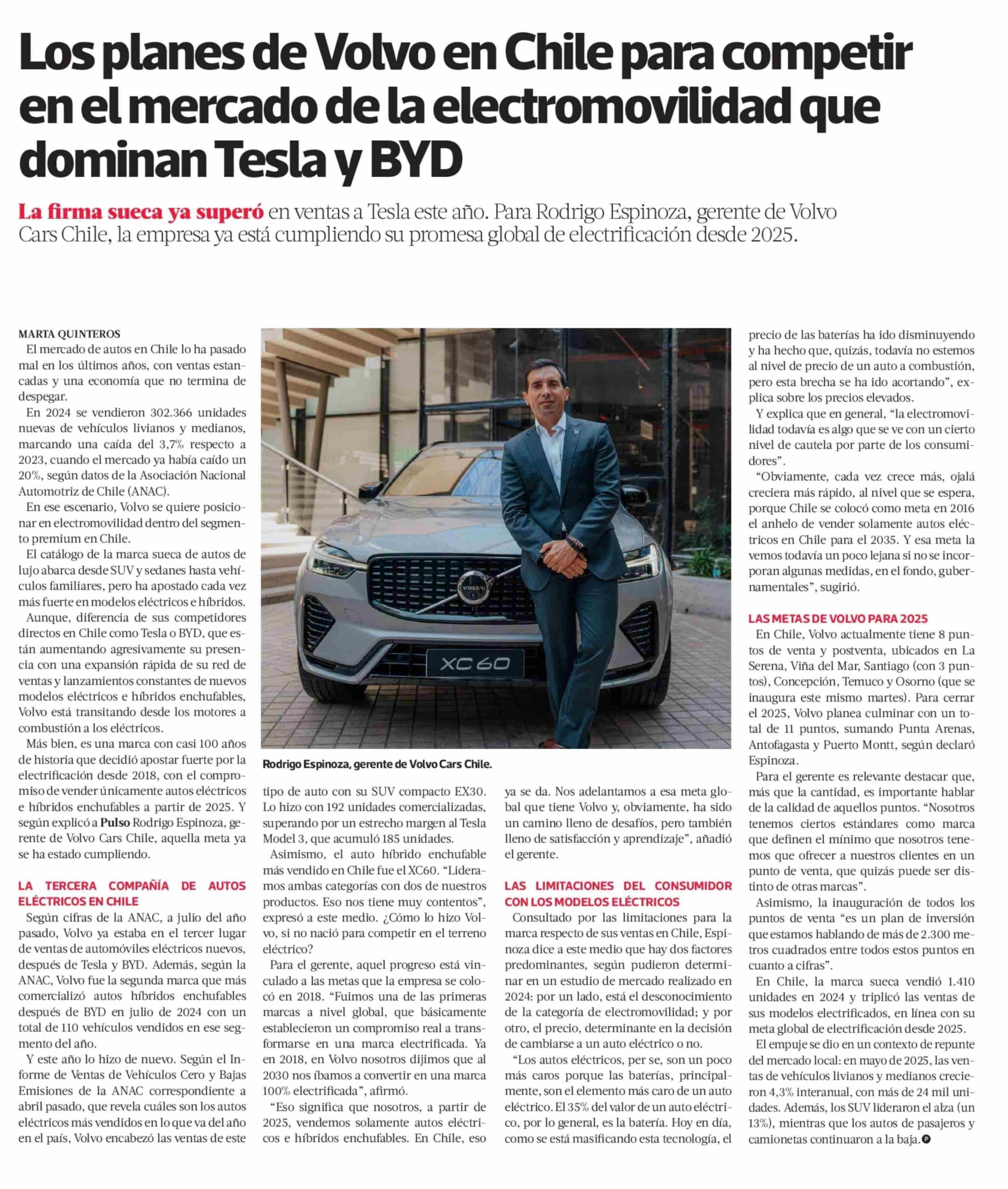 Los planes de Volvo en Chile para competir en el mercado de la electromovilidad que dominan Tesla y BYD 11-06-2025 La Tercera |