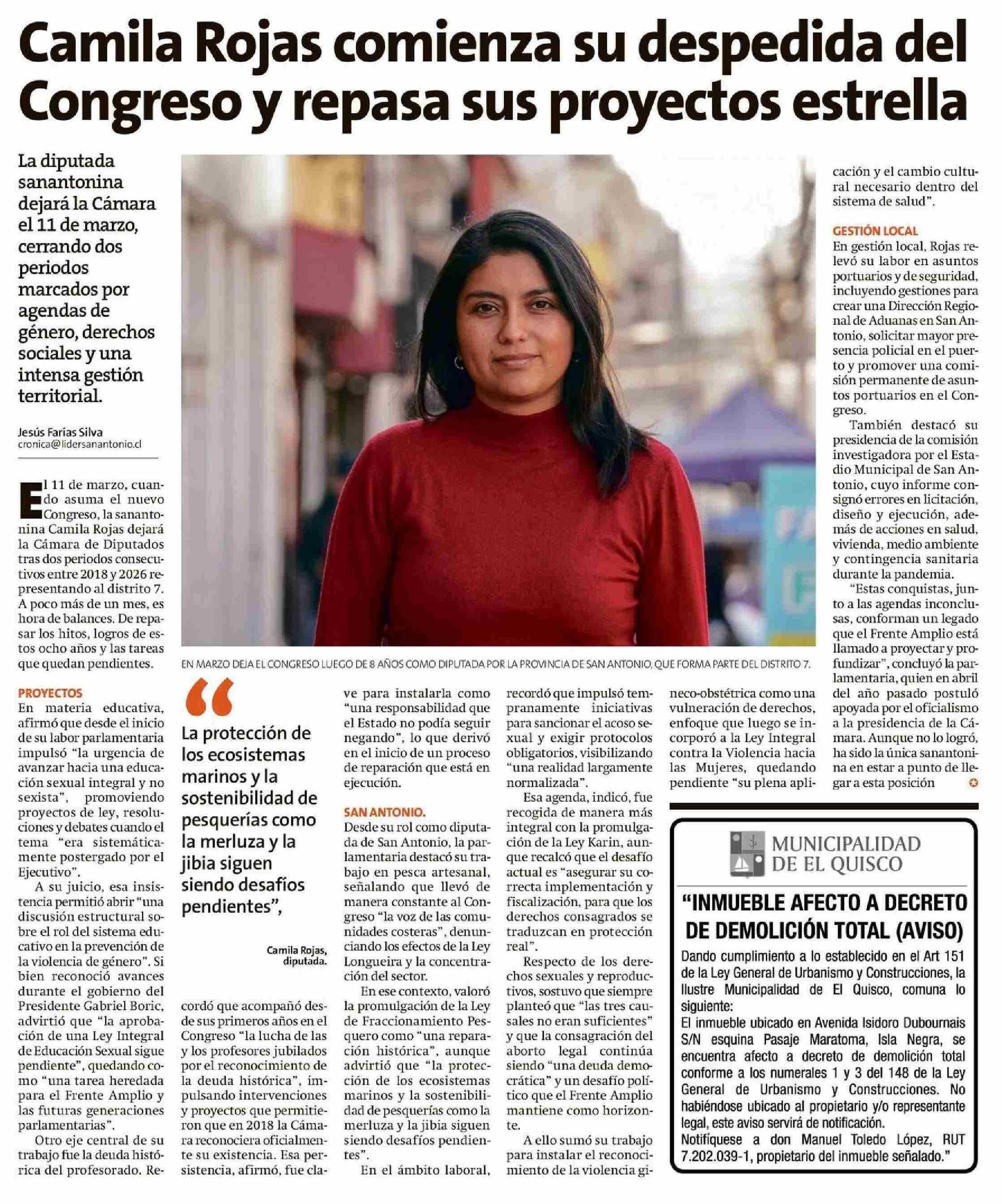 Camila Rojas comienza su despedida del Congreso y repasa sus proyectos estrella 26-01-2026 El Líder |