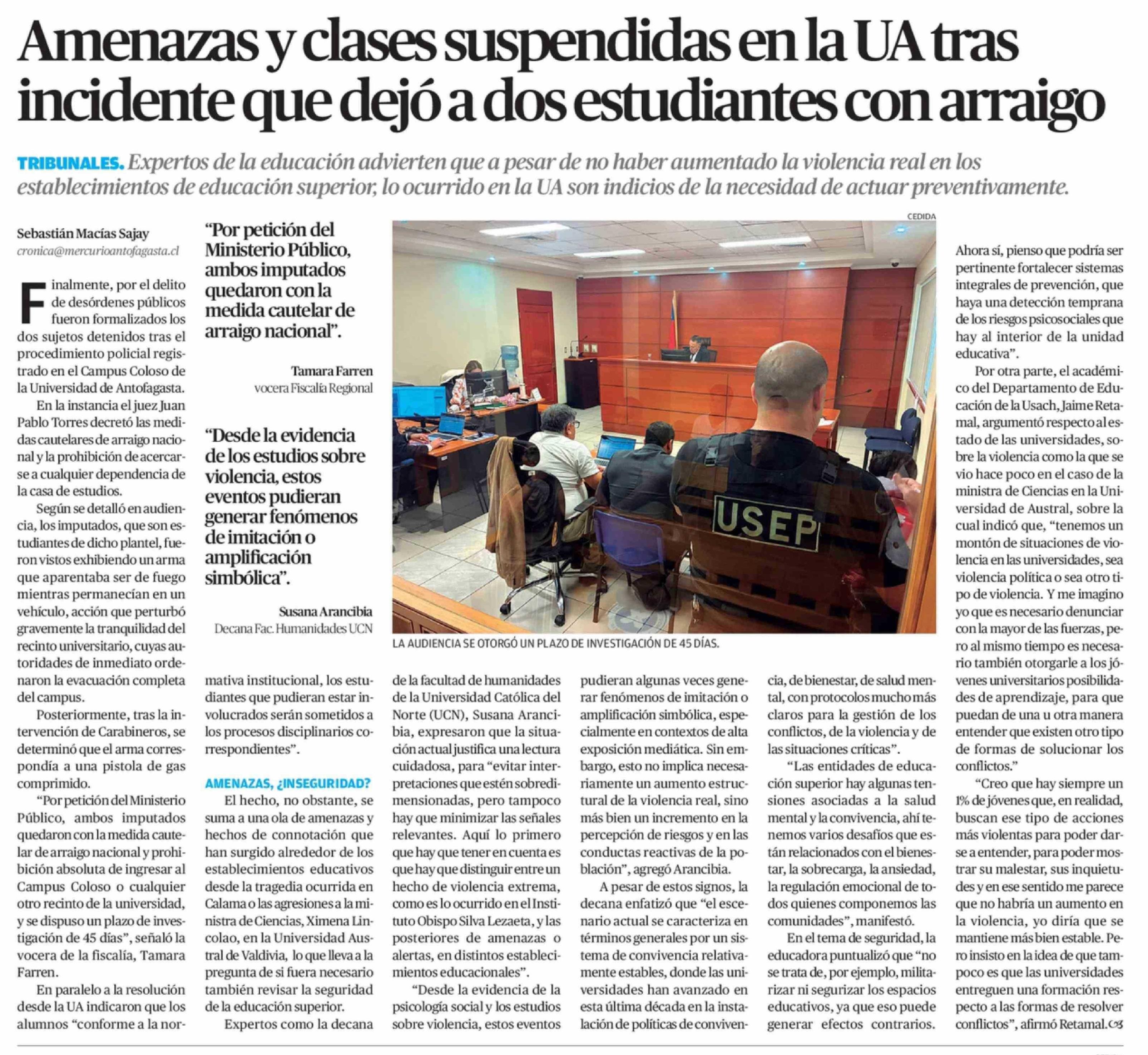 Amenazas y clases suspendidas en la UA tras incidente que dejó a dos estudiantes con arraigo 10-04-2026 El Mercurio de Antofagasta |
