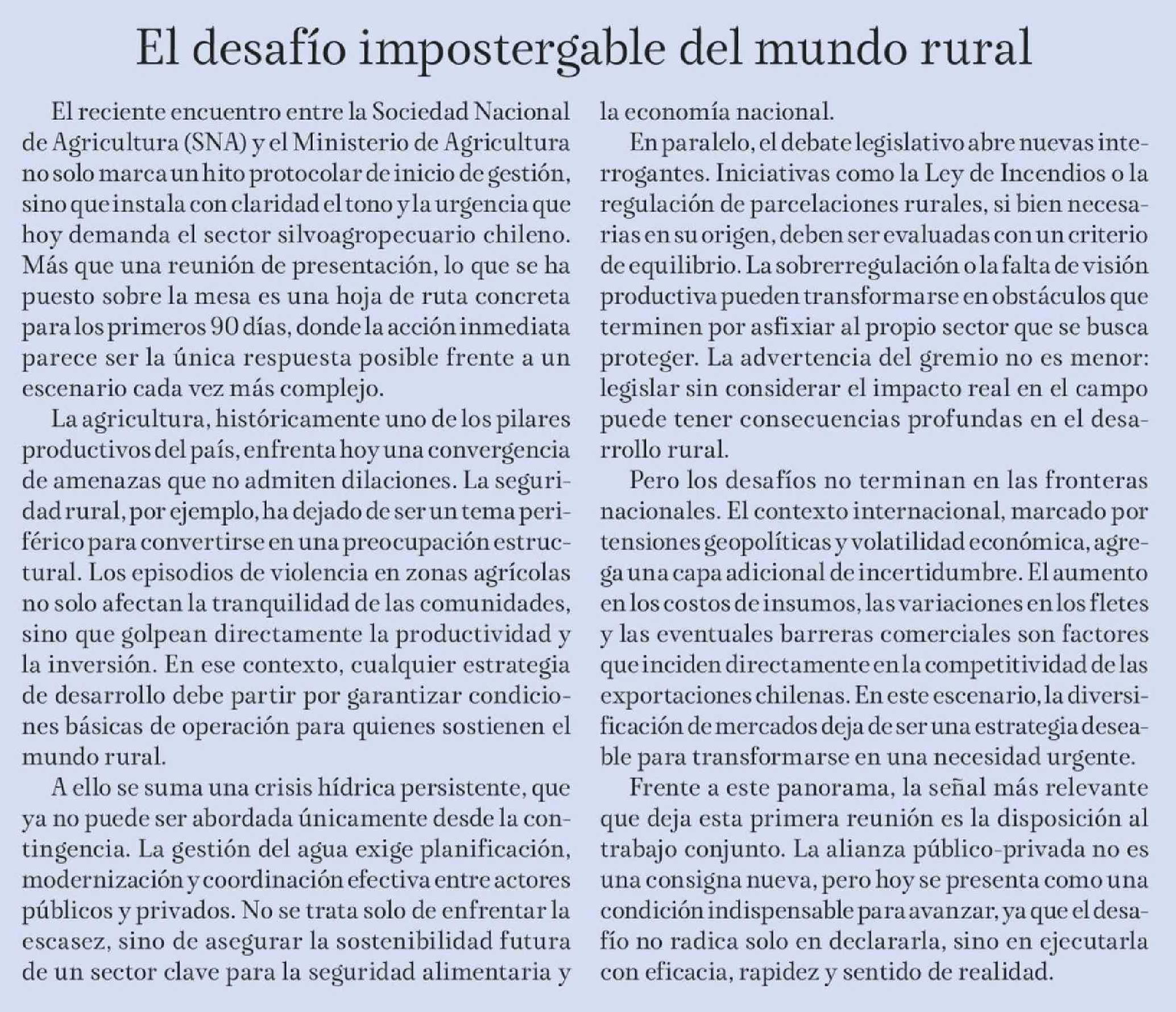 Editorial: El desafío impostergable del mundo rural 20-03-2026 La Tribuna |