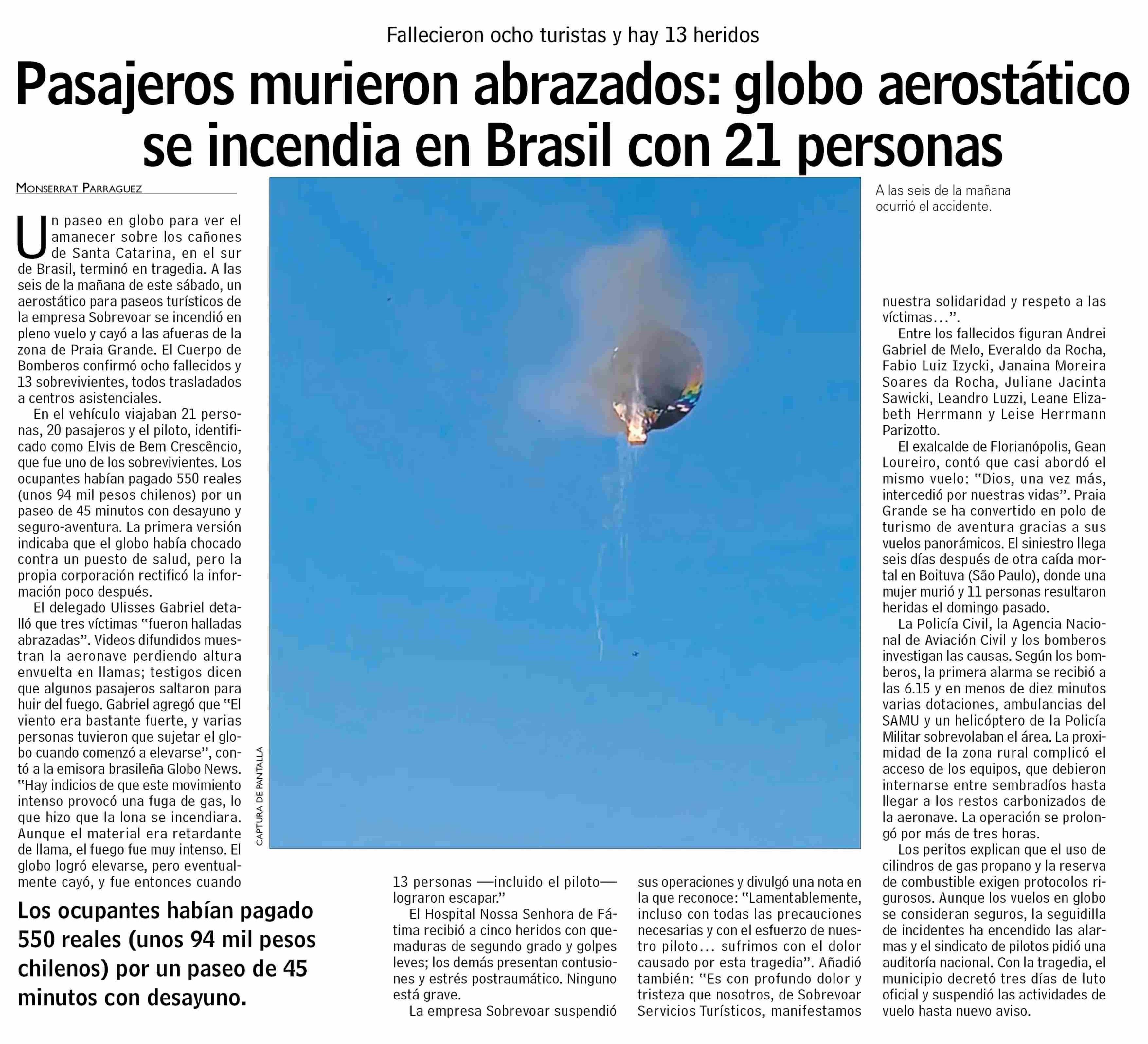 Pasajeros murieron abrazados: globo aerostático se incendia en Brasil con 21 personas 22-06-2025 Las Últimas Noticias |