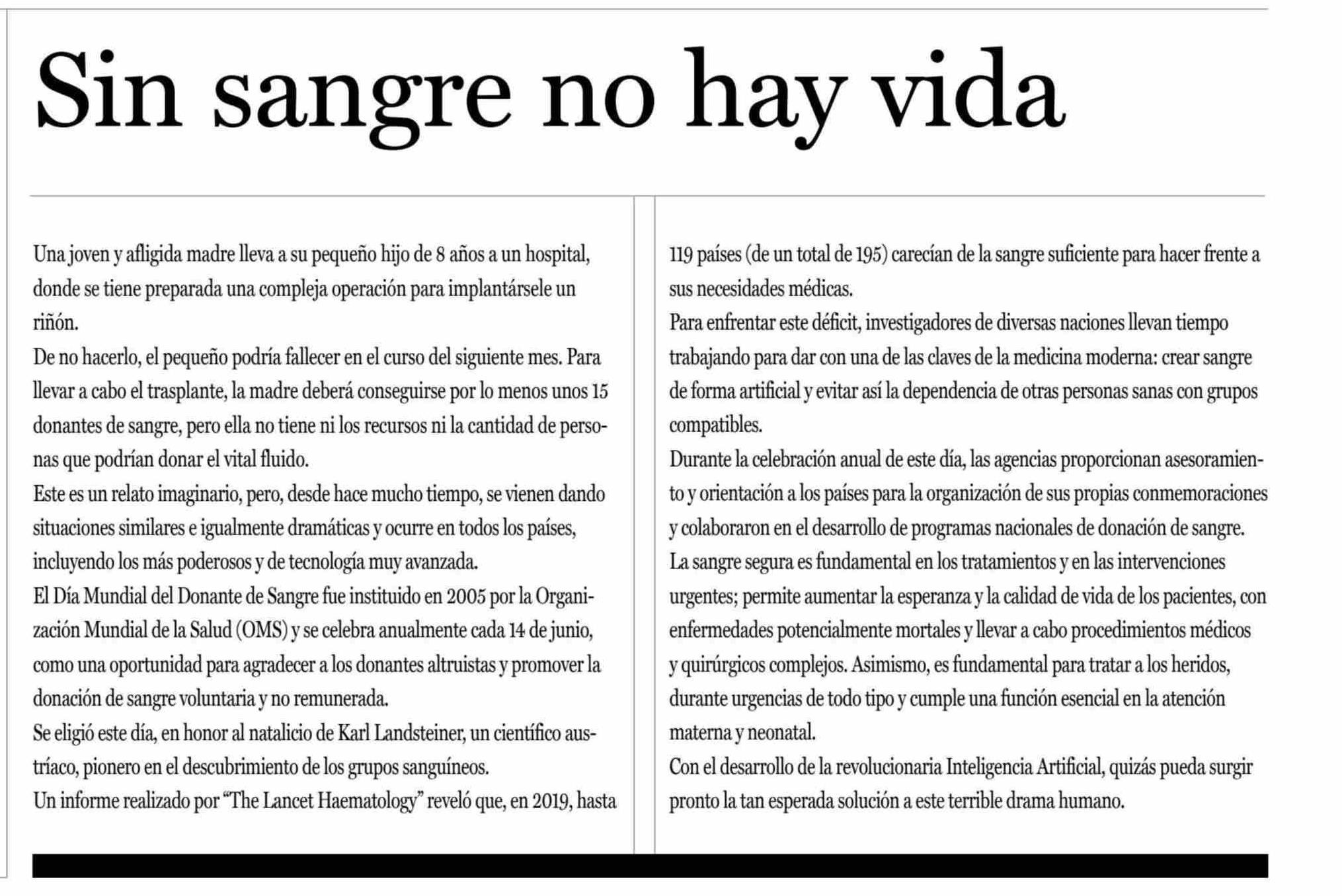 EDITORIAL: Sin sangre no hay vida 14-06-2025 La Prensa de Curicó |