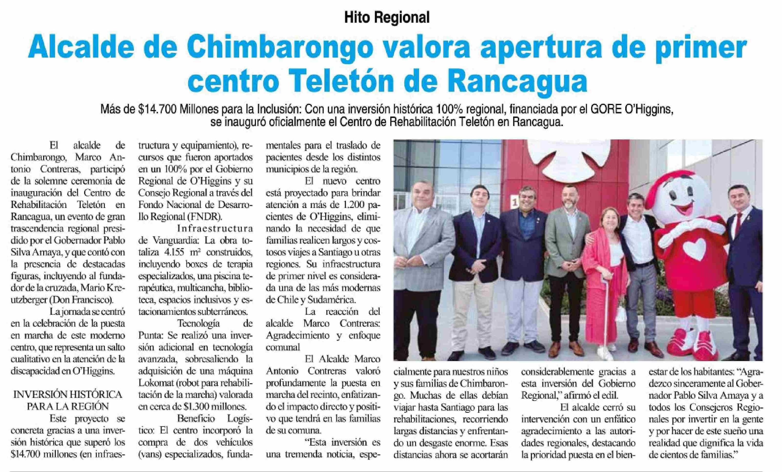 Alcalde de Chimbarongo valora apertura de primer centro Teletón de Rancagua 08-01-2026 Diario VI Región |