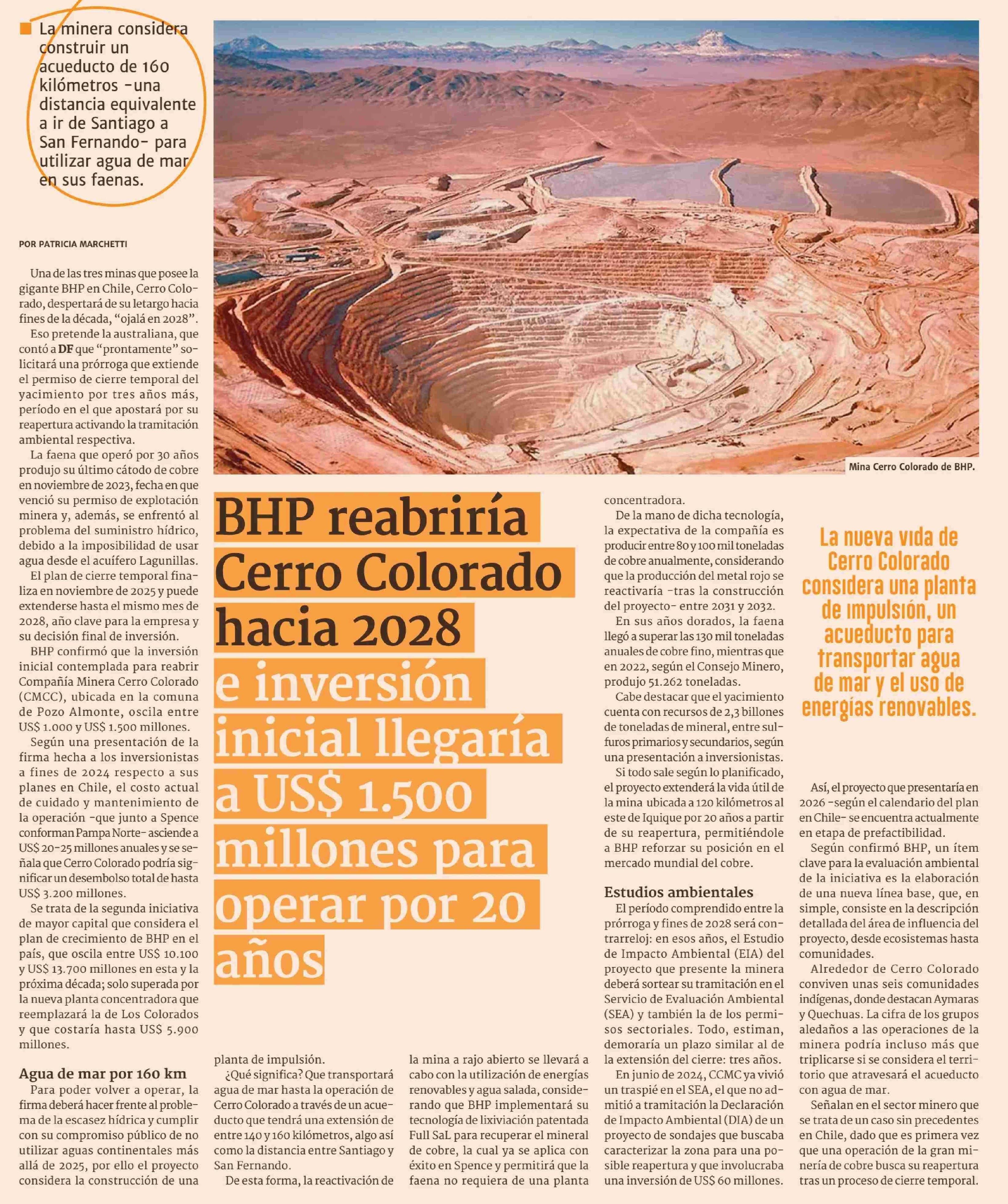 BHP reabriría Cerro Colorado hacia 2028 e inversión inicial llegaría a US$ 1.500 millones para operar por 20 años 13-03-2025 Diario Financiero |