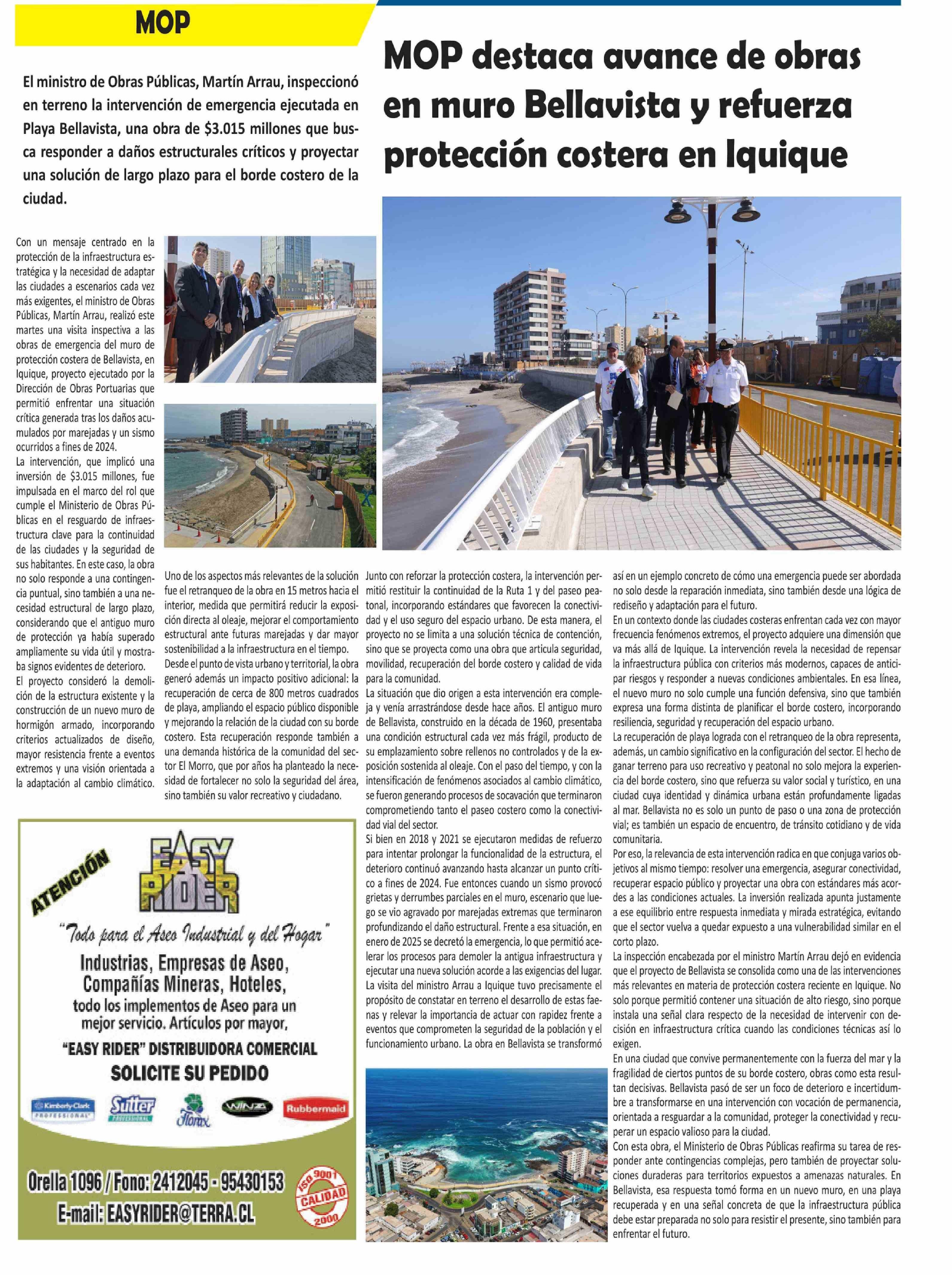MOP destaca avance de obras en muro Bellavista y refuerza protección costera en Iquique 12-04-2026 El Longino |