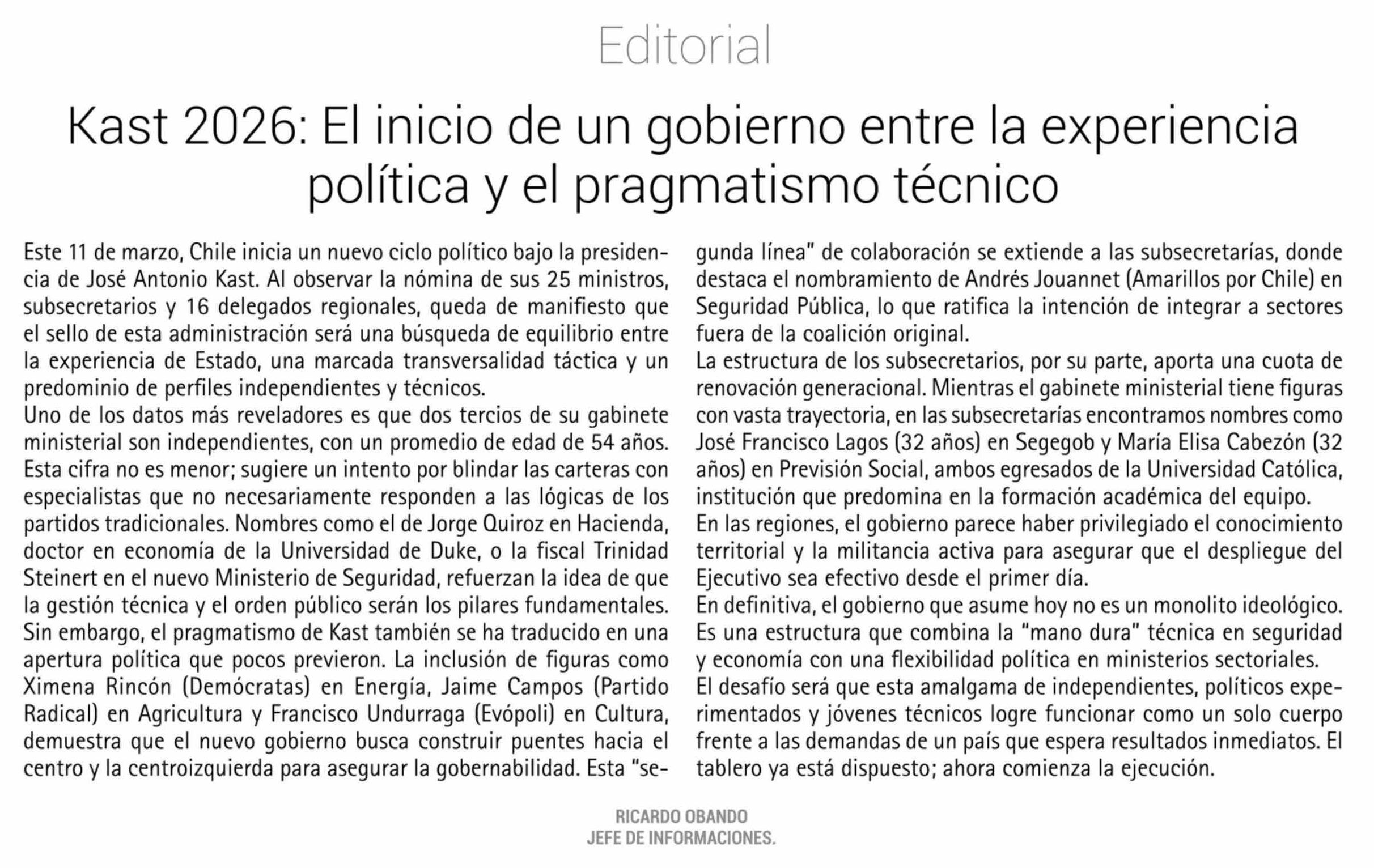 Título: Editorial: Kast 2026: El inicio de un gobierno entre la experiencia política y el pragmatismo técnico