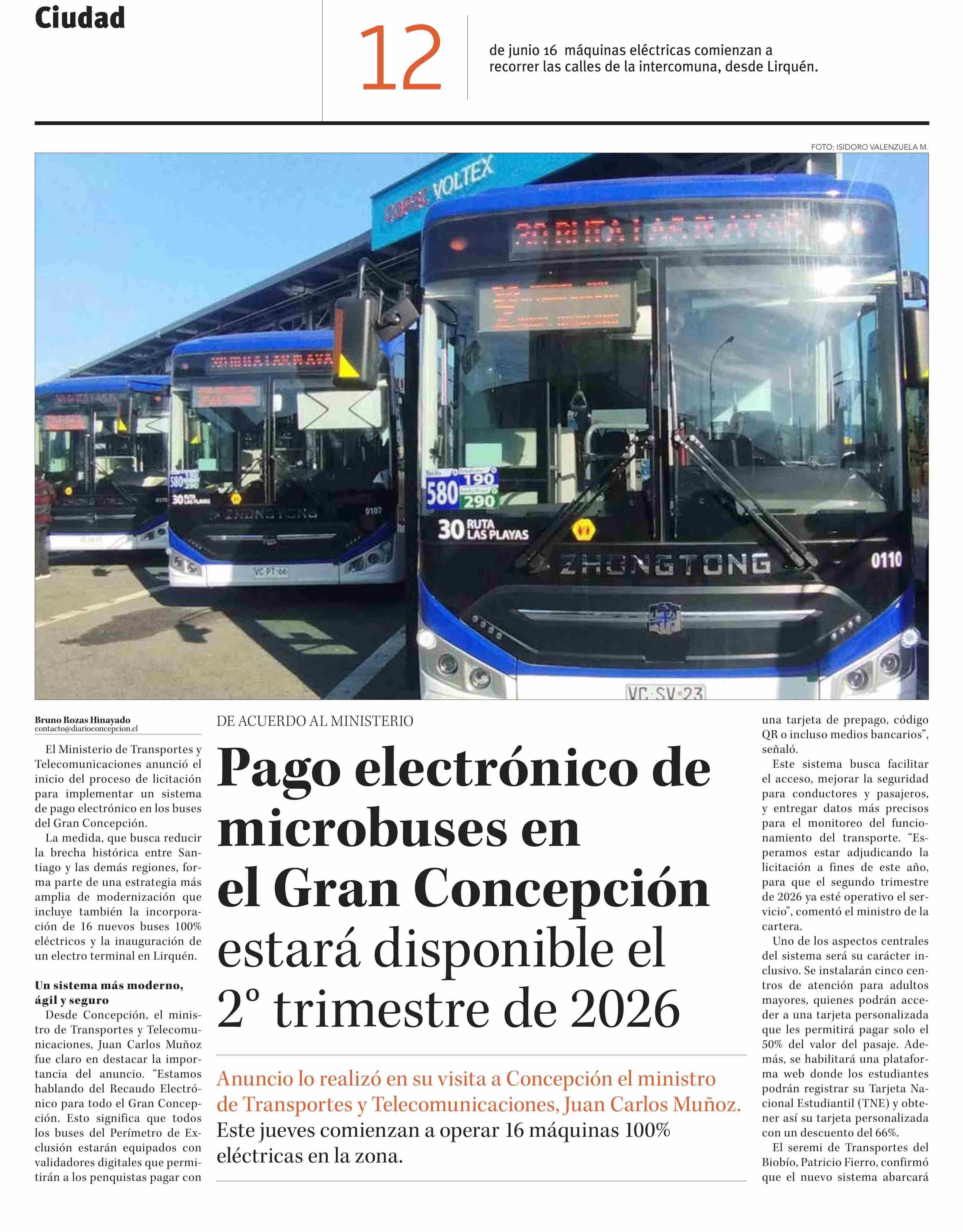 Pago electrónico de microbuses en el Gran Concepción estará disponible el 2° trimestre de 2026 11-06-2025 Diario Concepción |