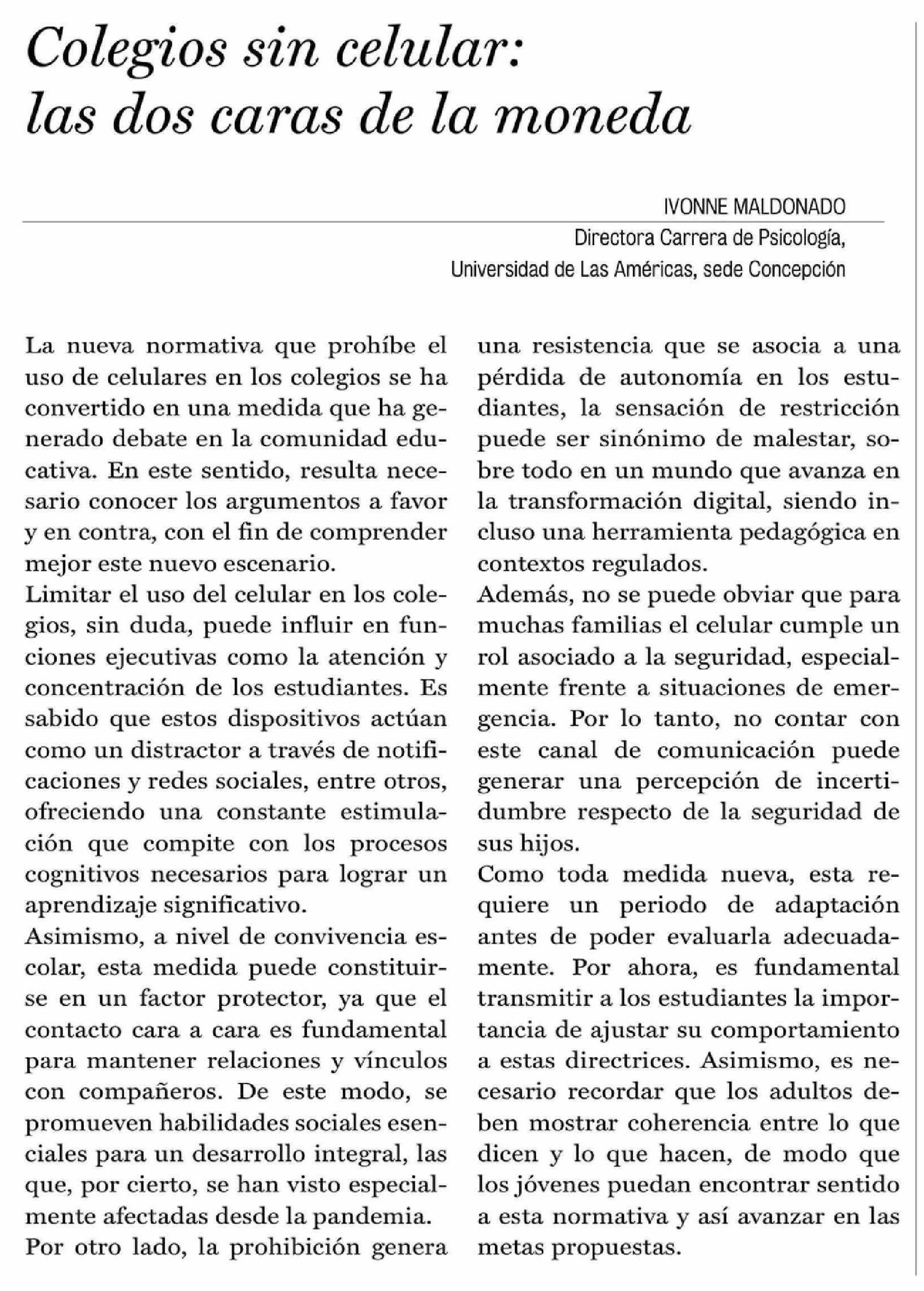 Título: Cartas: Colegios sin celular: las dos caras de la moneda