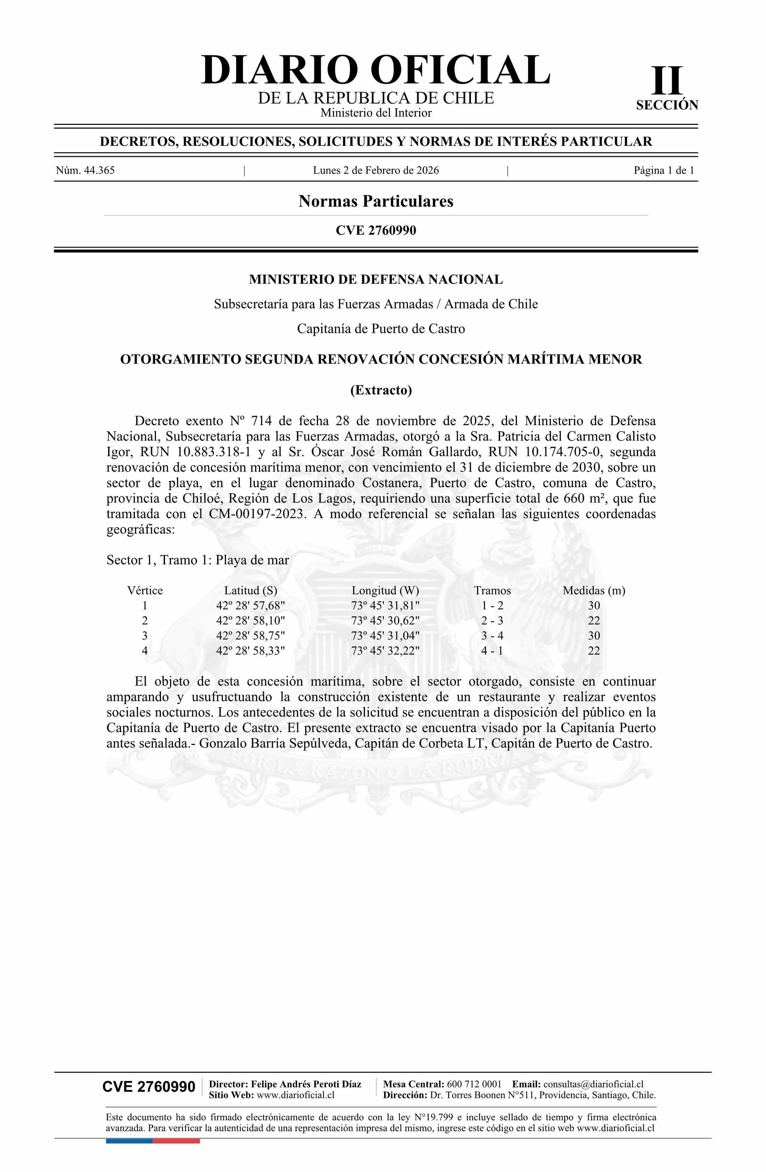 | Título: | Extracto de decreto exento número 714, de 2025.- Otorgamiento segunda renovación concesión marítima menor |