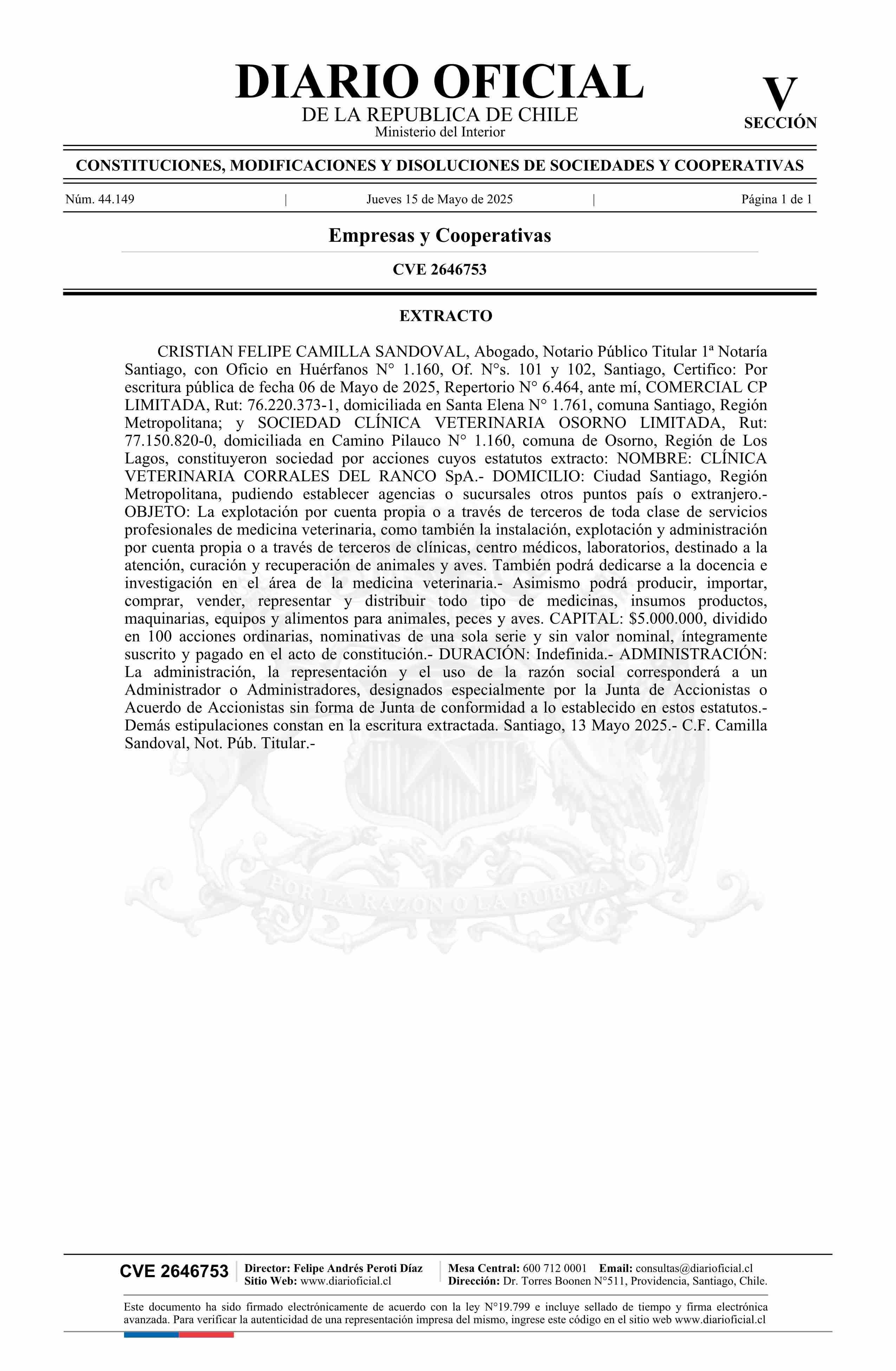 CLÍNICA VETERINARIA CORRALES DEL RANCO SpA 15-05-2025 Diario Oficial Edición Electrónica |