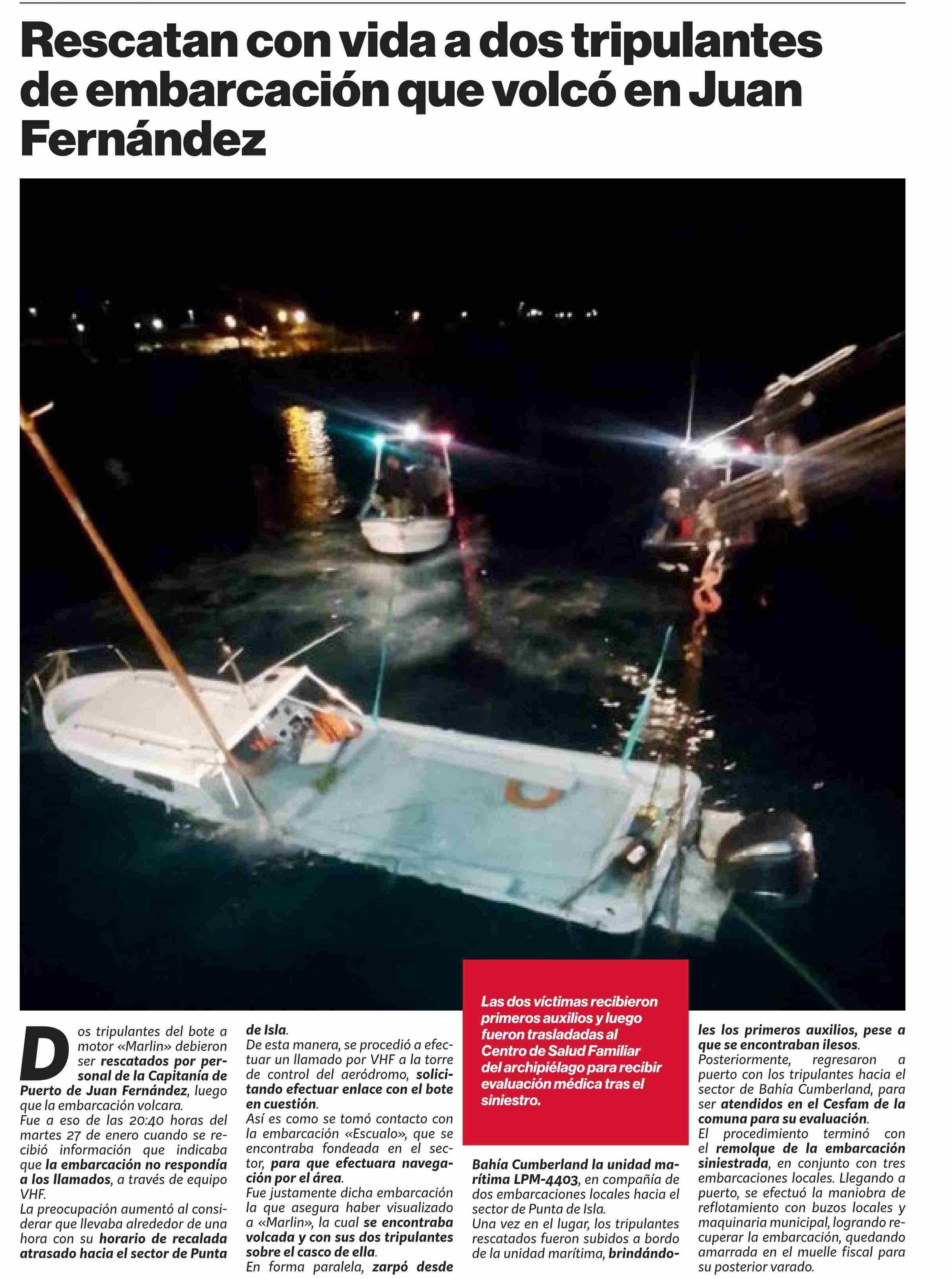 Rescatan con vida a dos tripulantes de embarcación que volcó en Juan Fernández 28-01-2026 Puranoticia.cl |