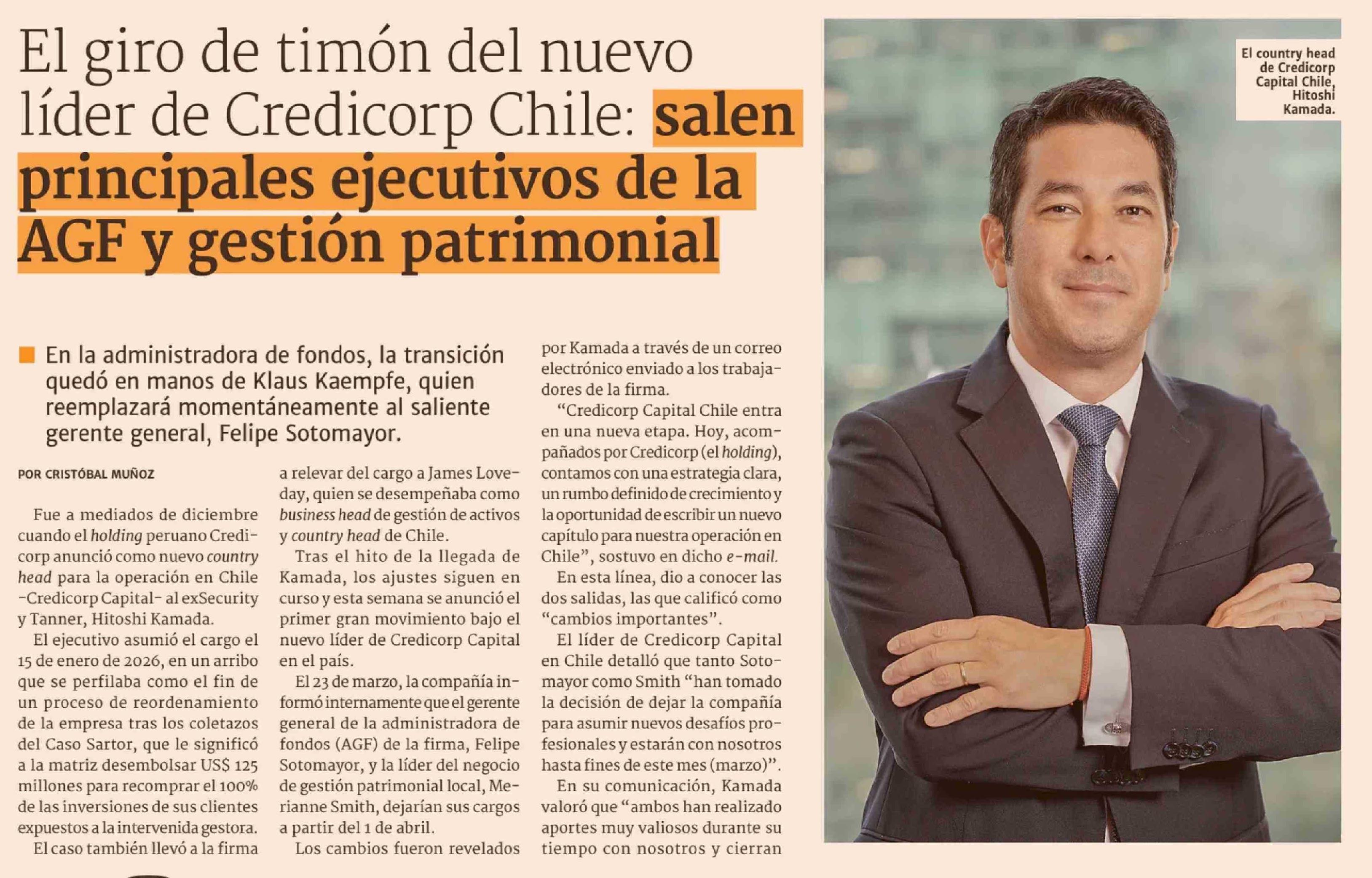 El giro de timón del nuevo líder de Credicorp Chile: salen principales ejecutivos de la AGF y gestión patrimonial 02-04-2026 Diario Financiero |