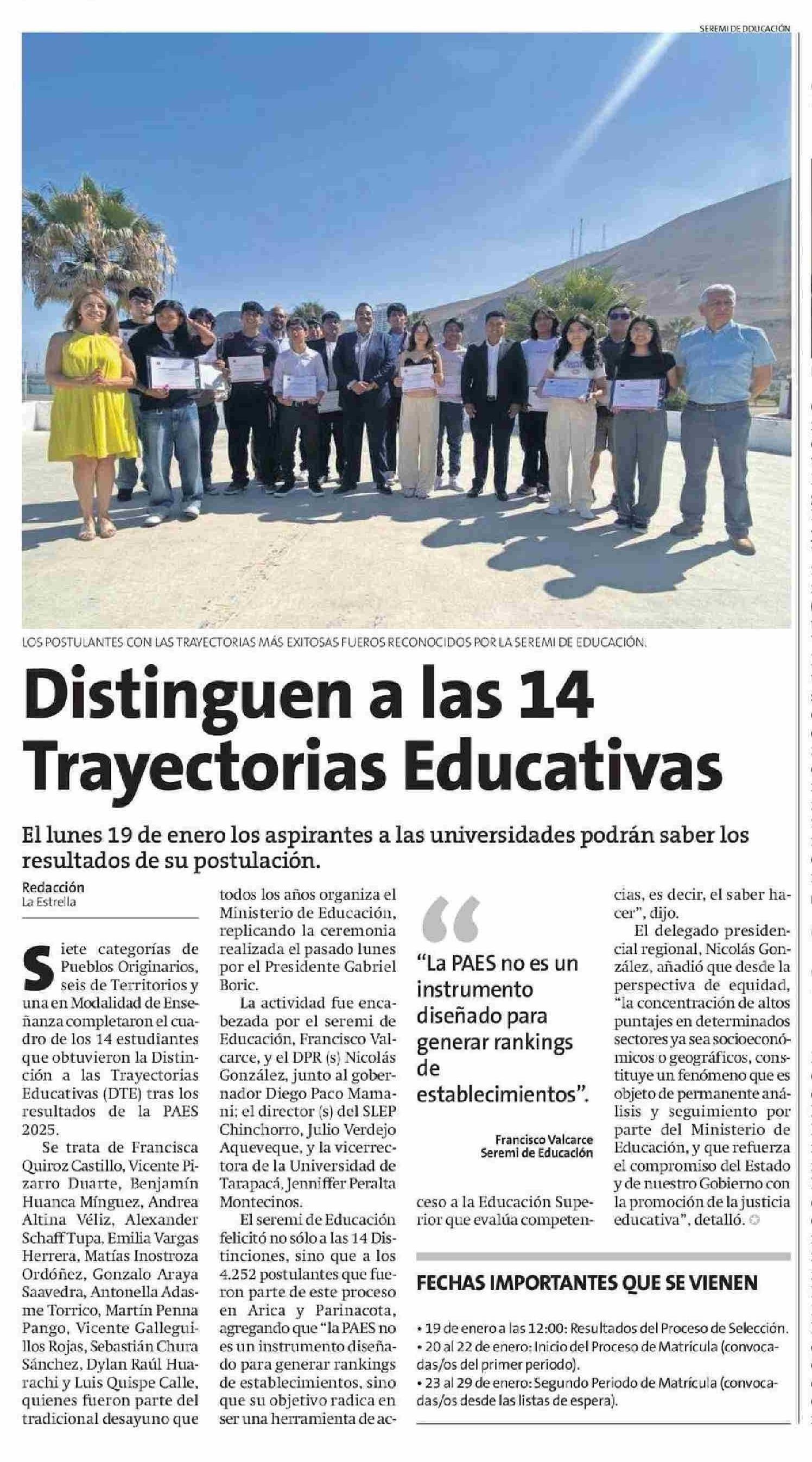 Distinguen a las 14 Trayectorias Educativas 10-01-2026 La Estrella de Arica |
