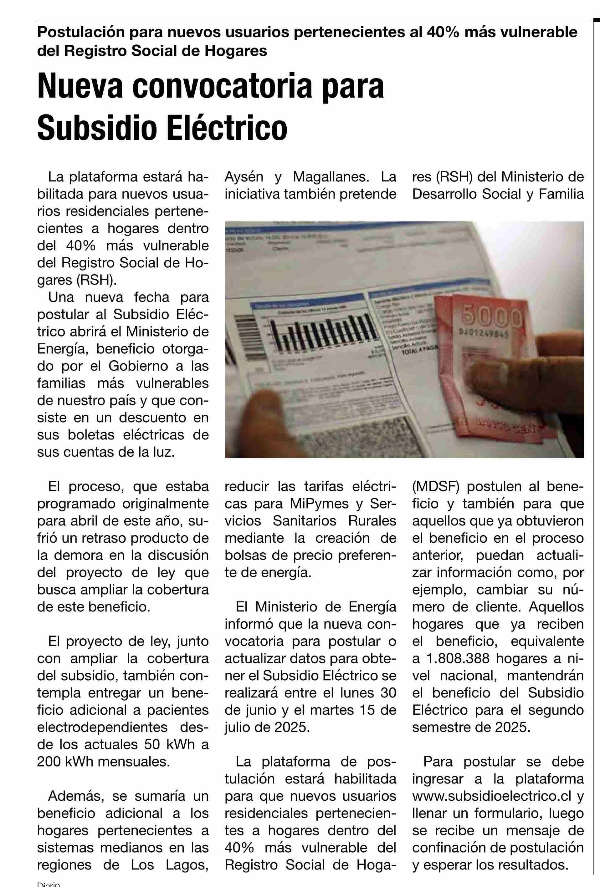 | Título: | Nueva convocatoria para Subsidio Eléctrico |