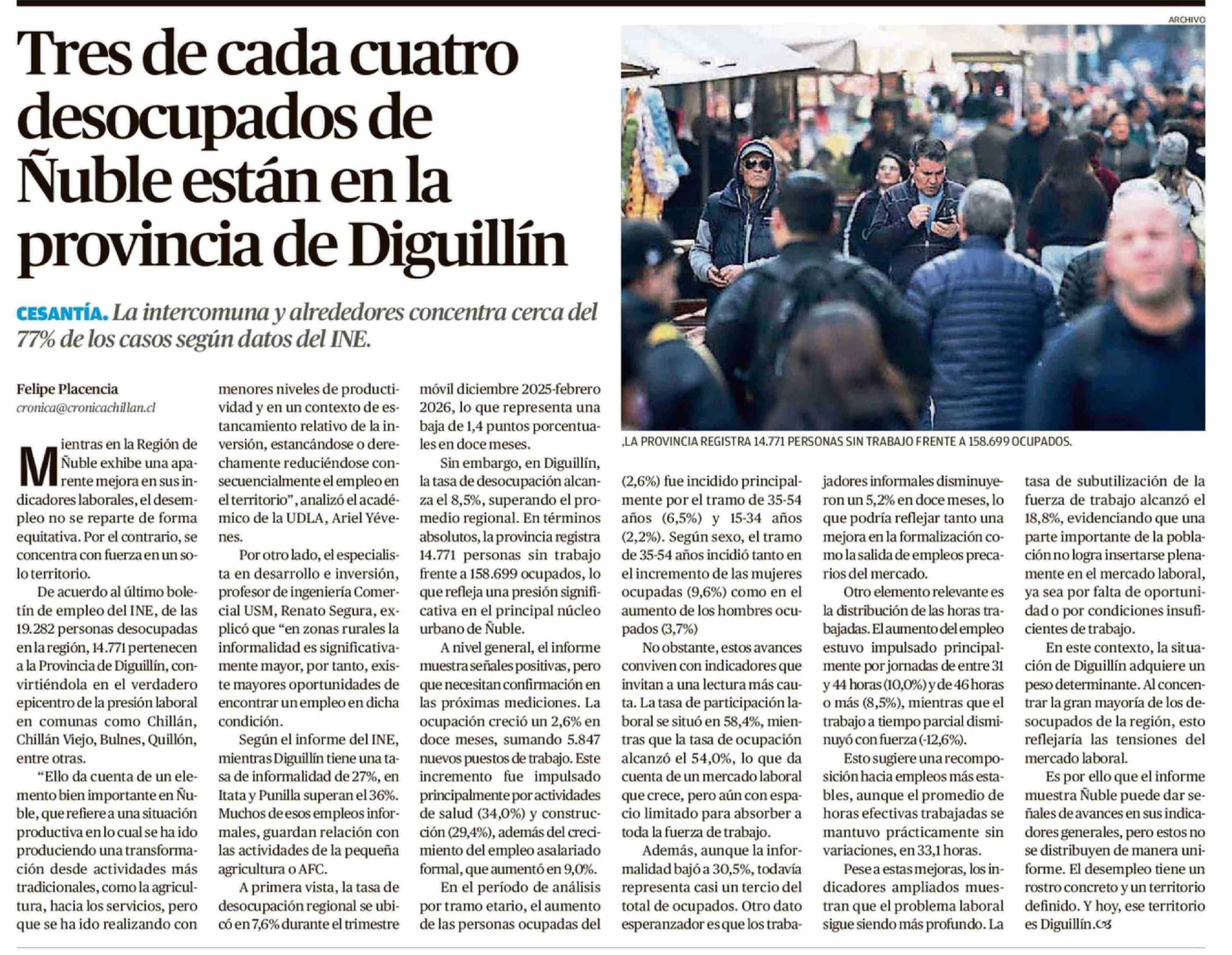 Tres de cada cuatro desocupados de Ñuble están en la provincia de Diguillín 07-04-2026 Crónica de Chillán |