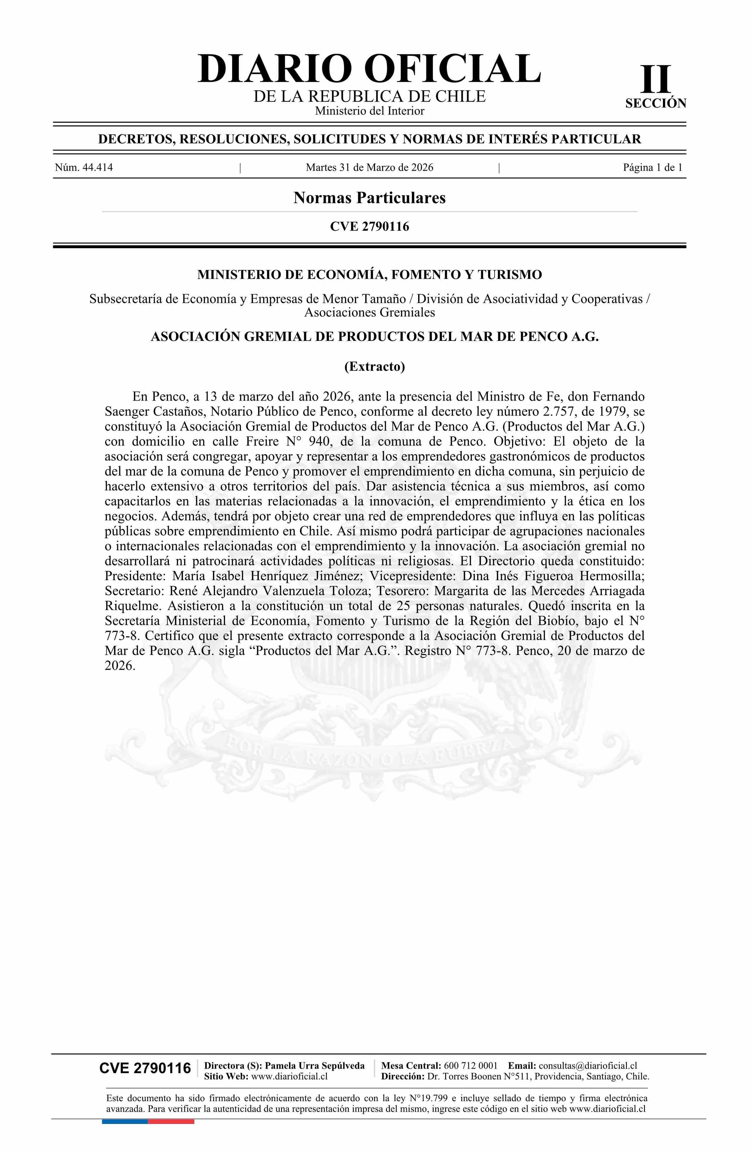 Constitución Asociación Gremial de Productos del Mar de Penco 31-03-2026 Diario Oficial Edición Electrónica |