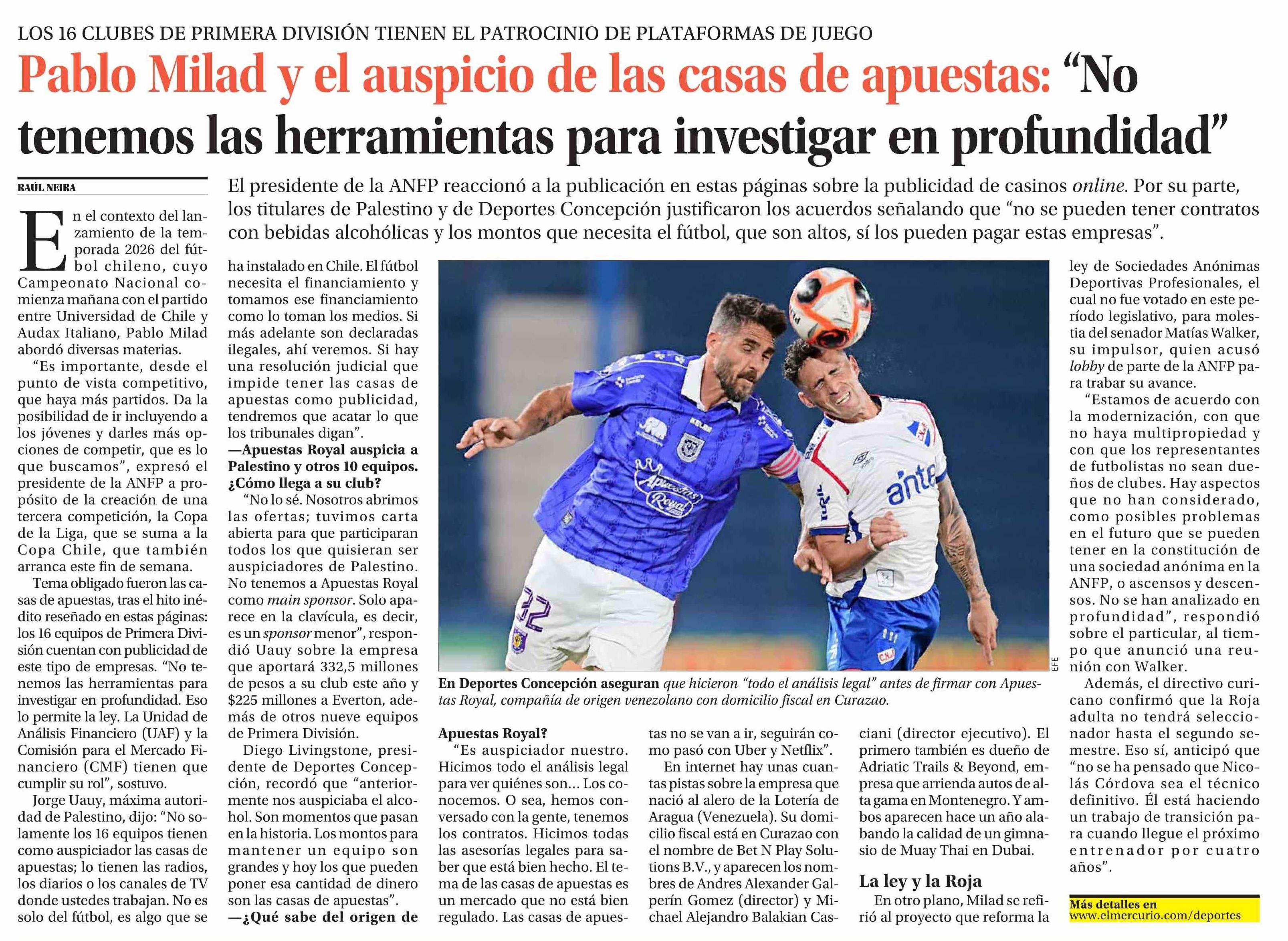 Pablo Milad y el auspicio de las casas de apuestas: “No tenemos las herramientas para investigar en profundidad” 29-01-2026 El Mercurio |
