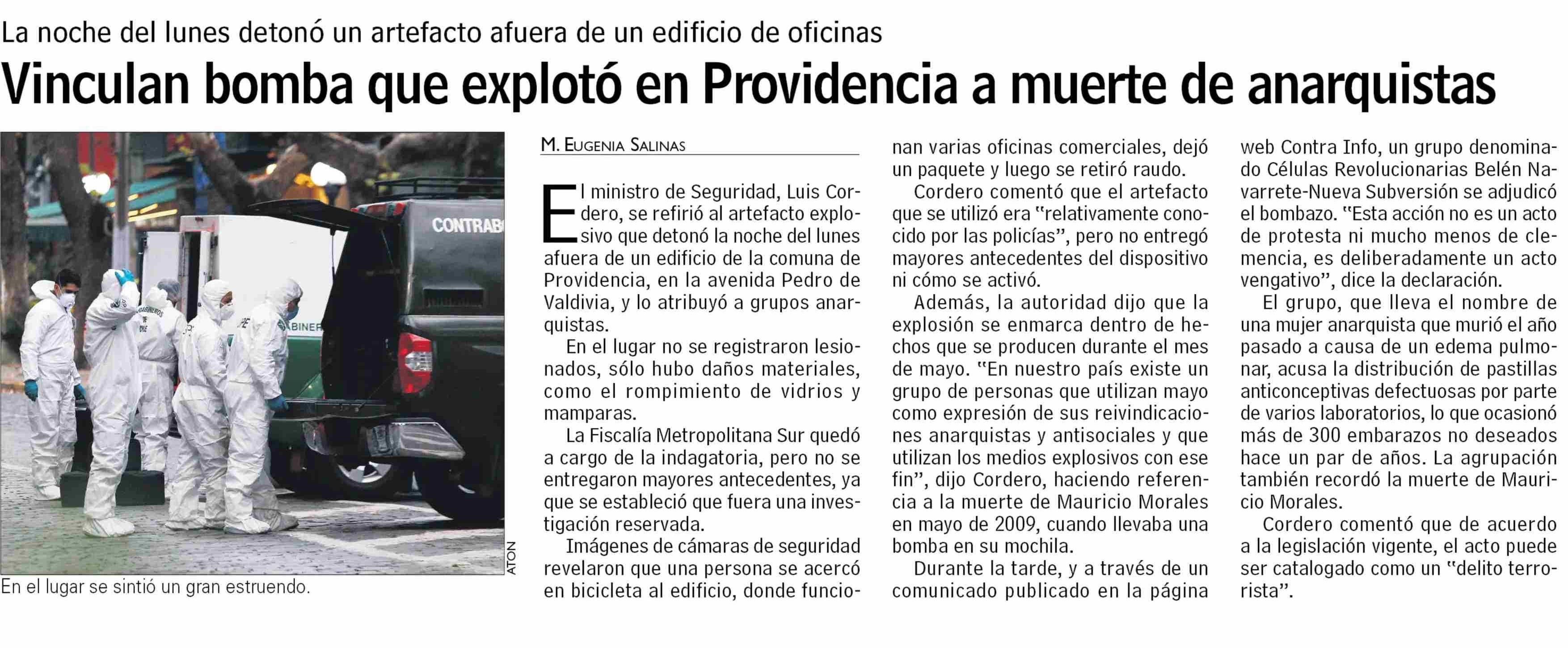 | Título: | Vinculan bomba que explotó en Providencia a muerte de anarquistas |