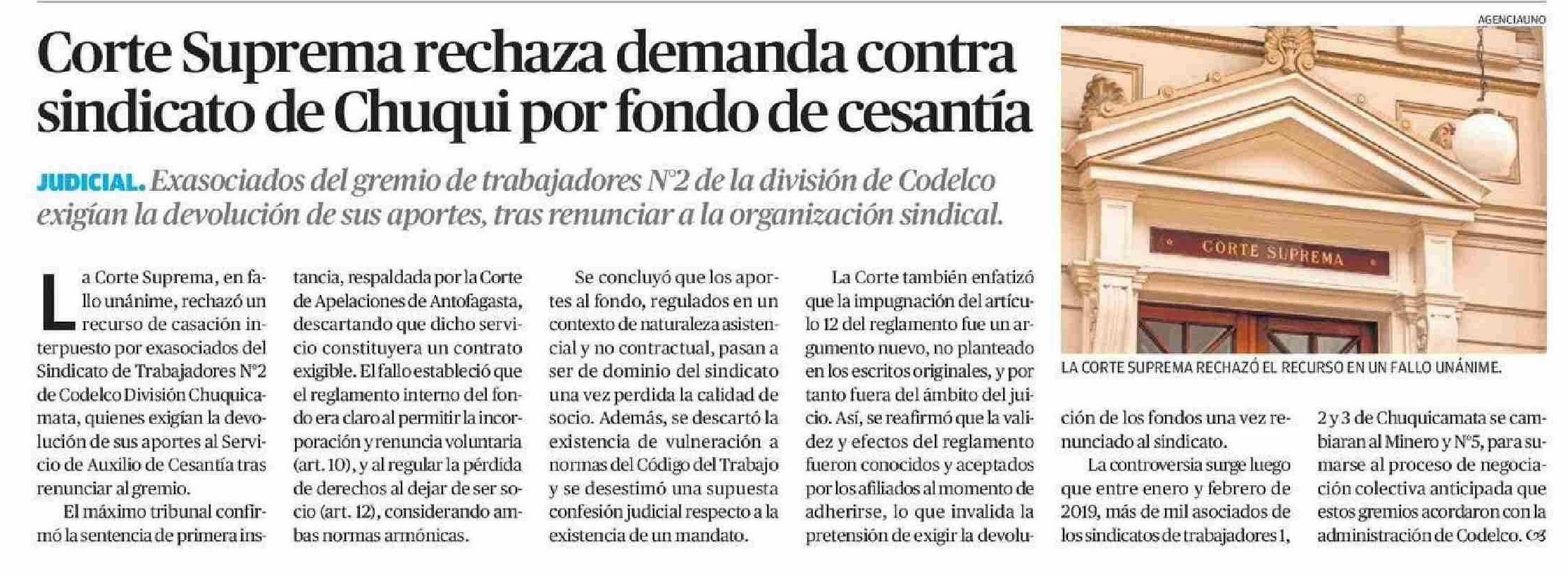 Corte Suprema rechaza demanda contra sindicato de Chuqui por fondo de cesantía 28-05-2025 El Mercurio de Antofagasta |