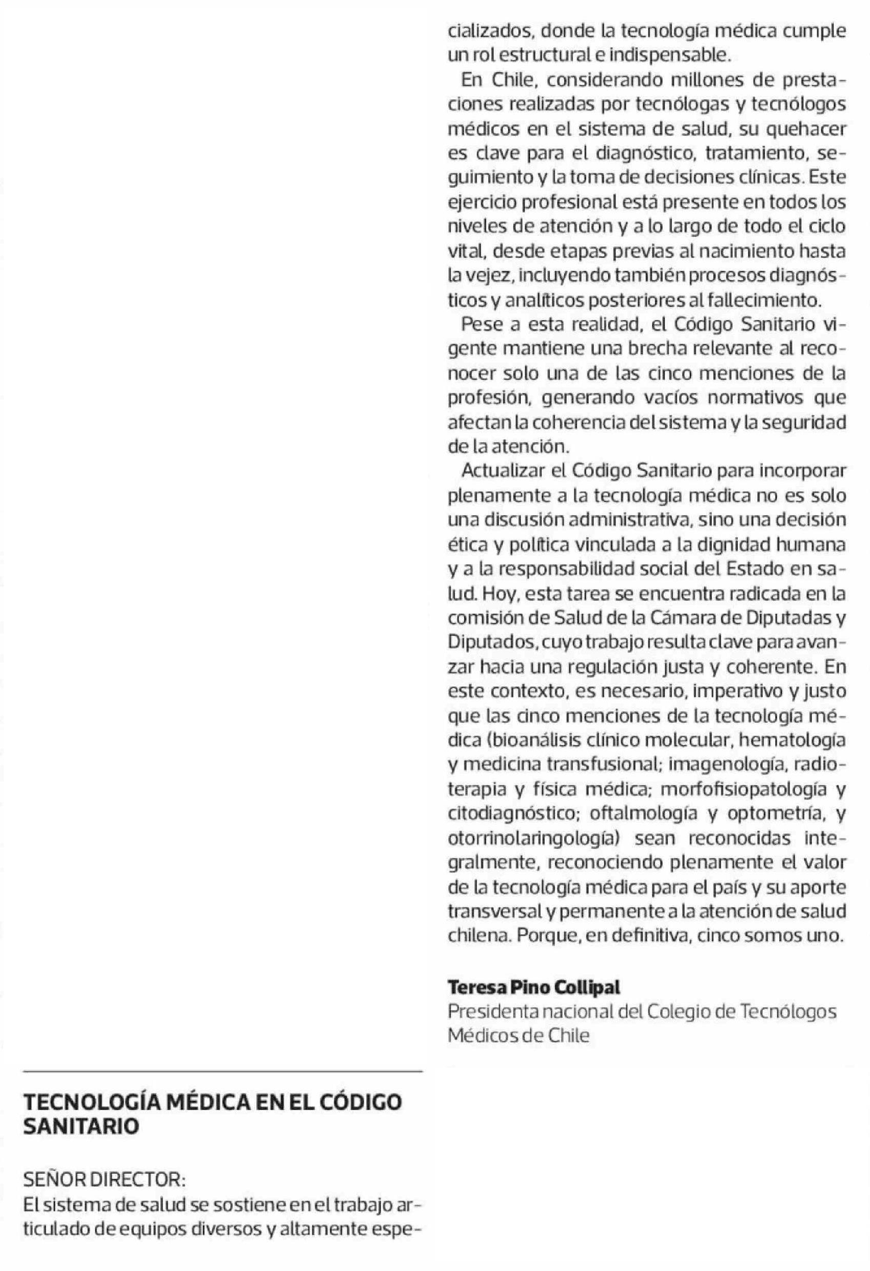 Cartas: TECNOLOGÍA MÉDICA EN EL CÓDIGO SANITARIO