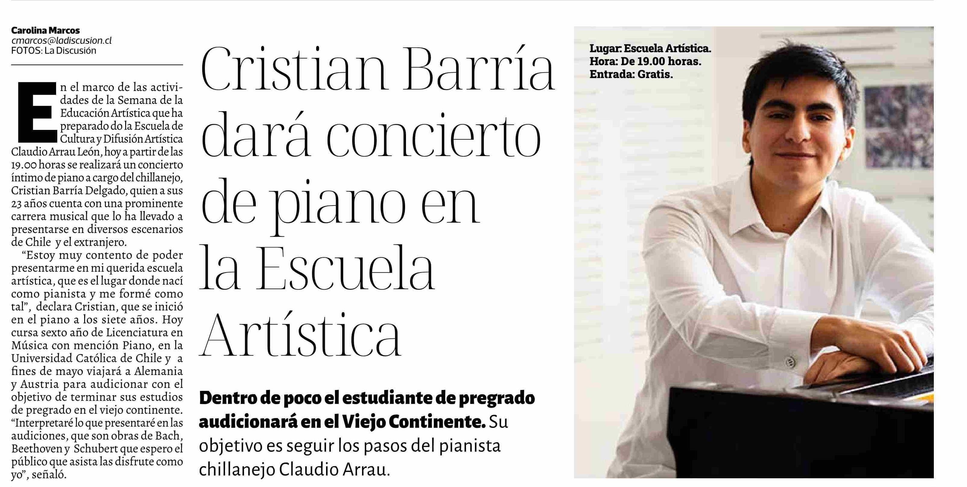 | Título: | Cristian Barría dará concierto de piano en la Escuela Artística |