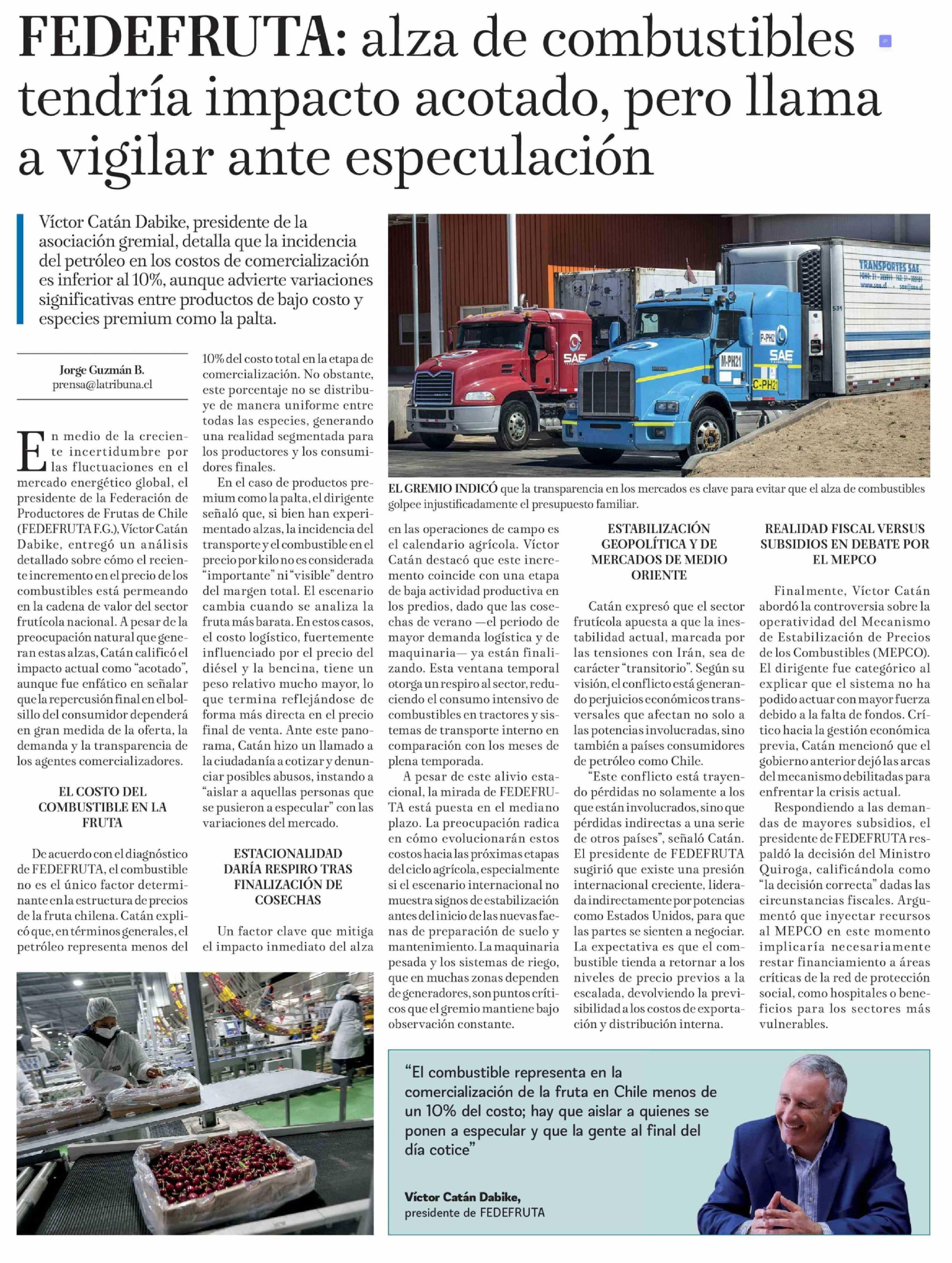 | Título: | FEDEFRUTA: alza de combustibles tendría impacto acotado, pero llama a vigilar ante especulación |