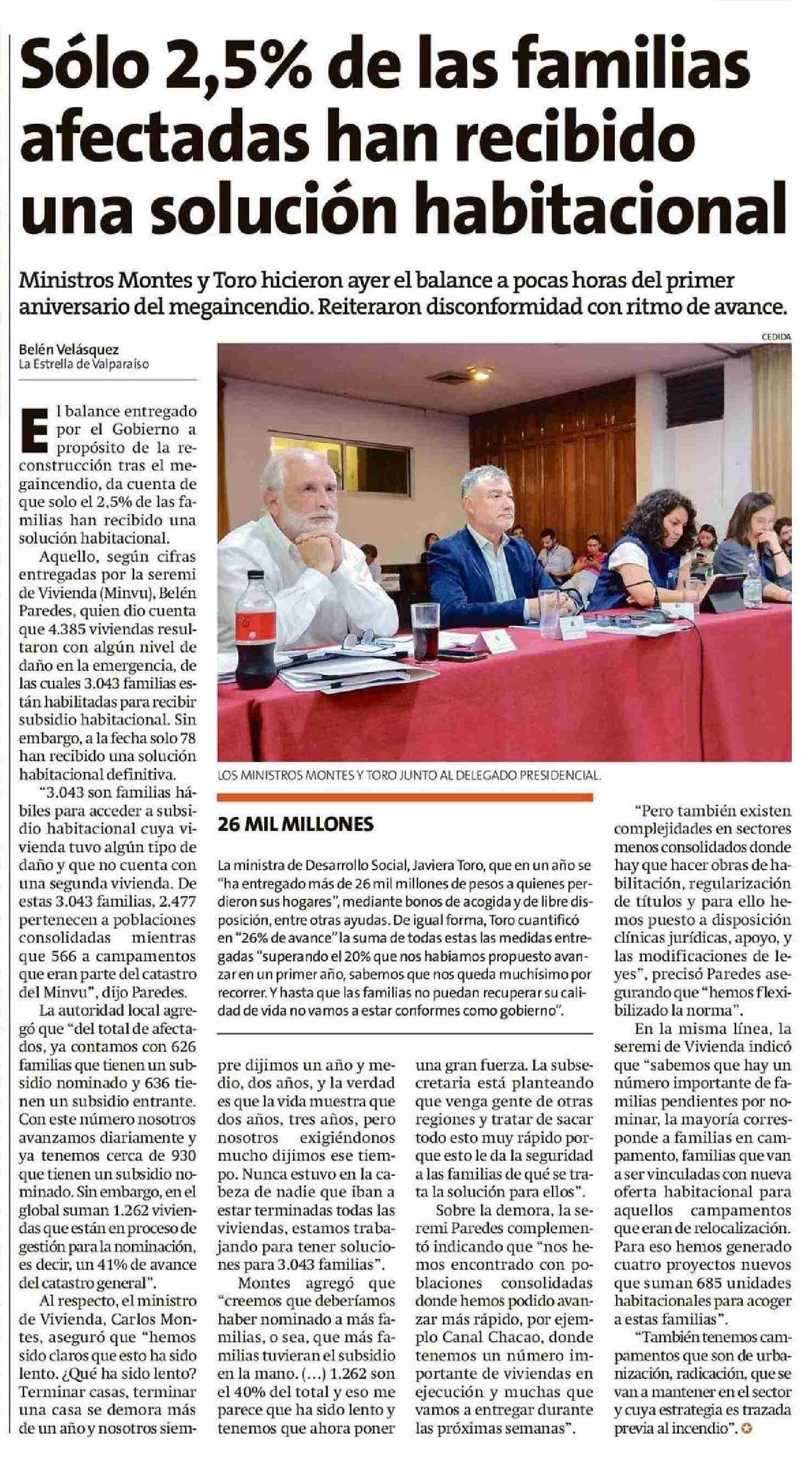 Sólo 2,5% de las familias una solución habitacional afectadas han recibido 01-02-2025 La Estrella de Valparaíso |