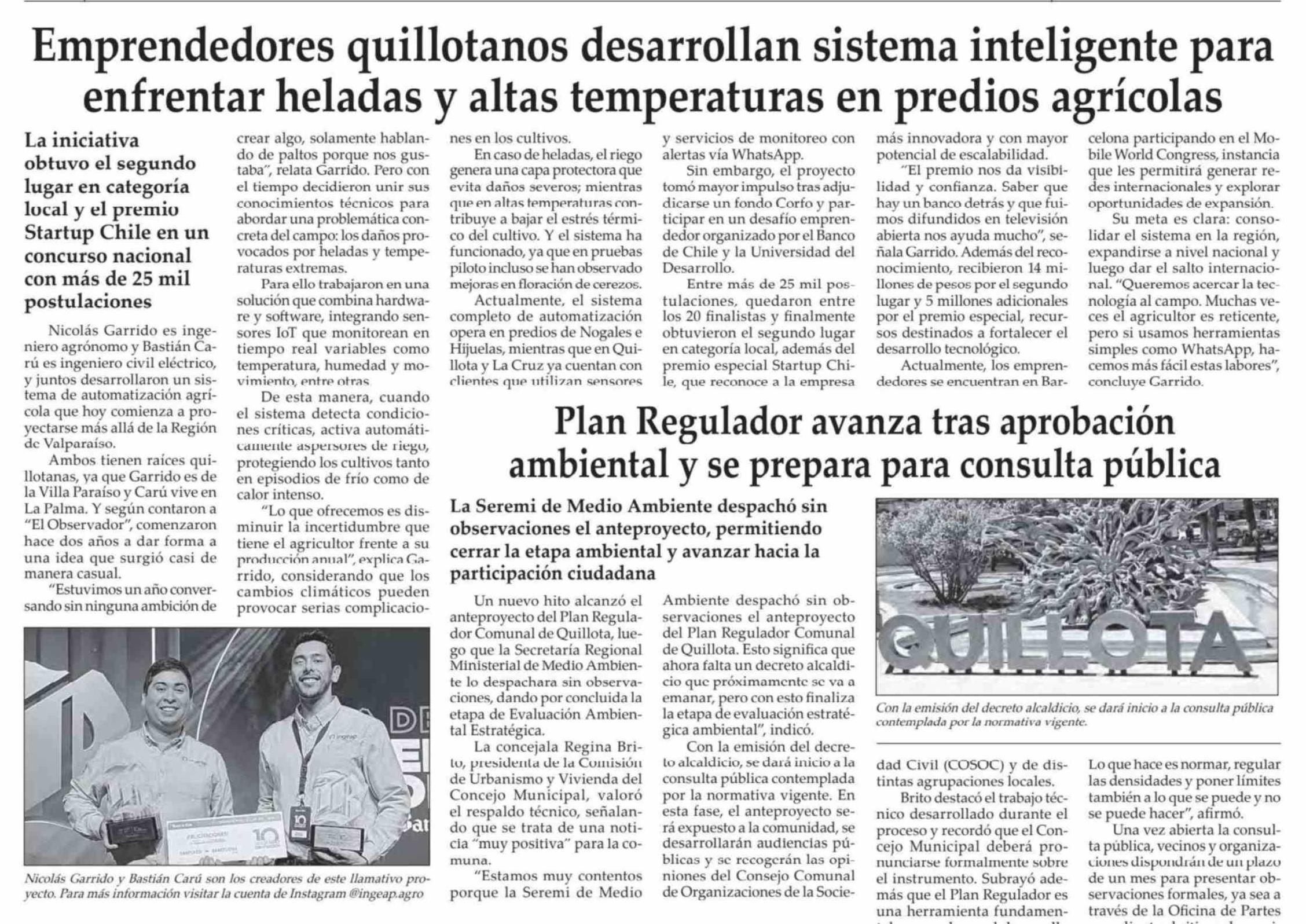 Emprendedores quillotanos desarrollan sistema inteligente para enfrentar heladas y altas temperaturas en predios agrícolas 06-03-2026 El Observador |