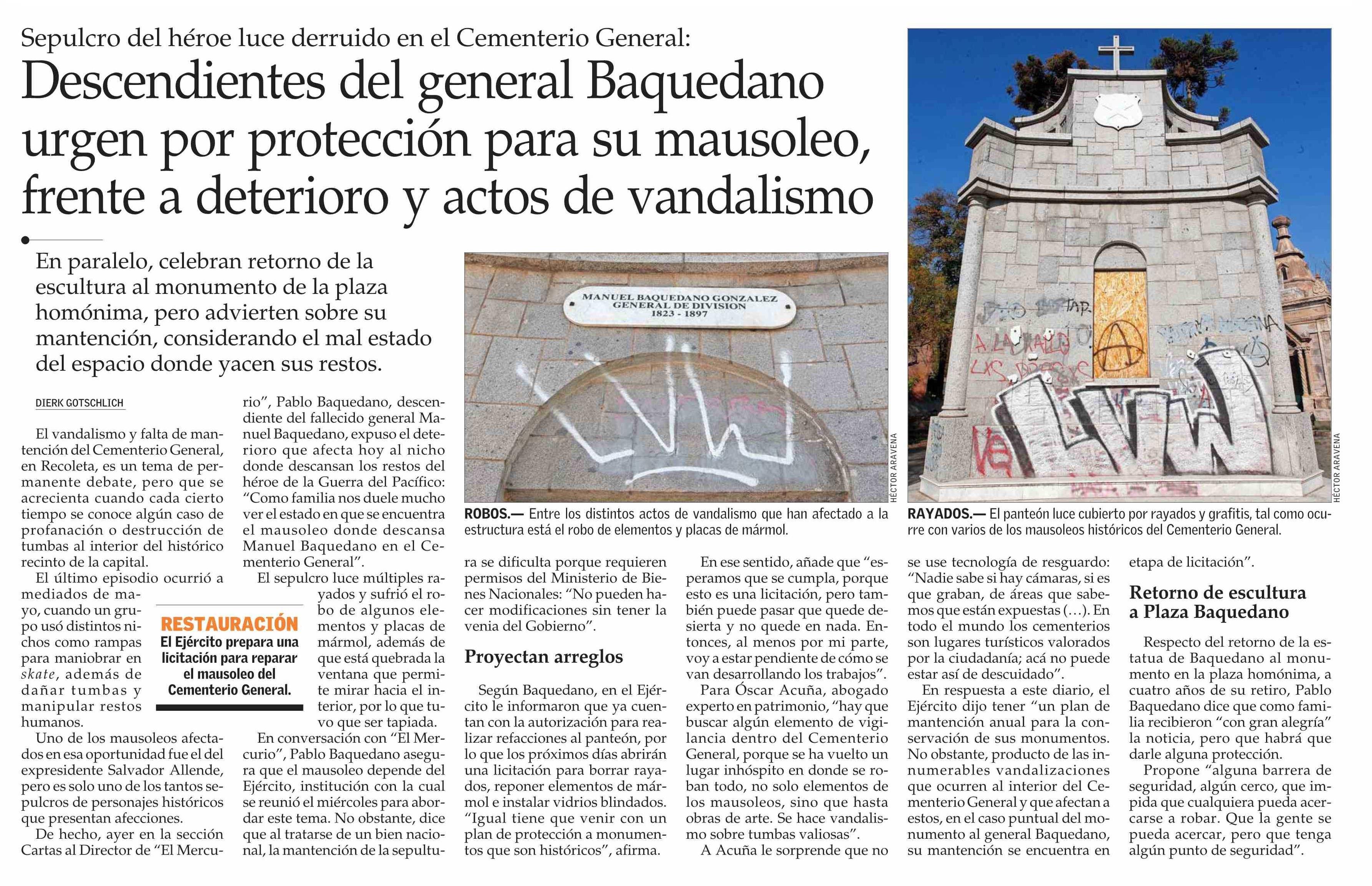 Descendientes del general Baquedano urgen por protección para su mausoleo, frente a deterioro y actos de vandalismo 06-06-2025 El Mercurio |