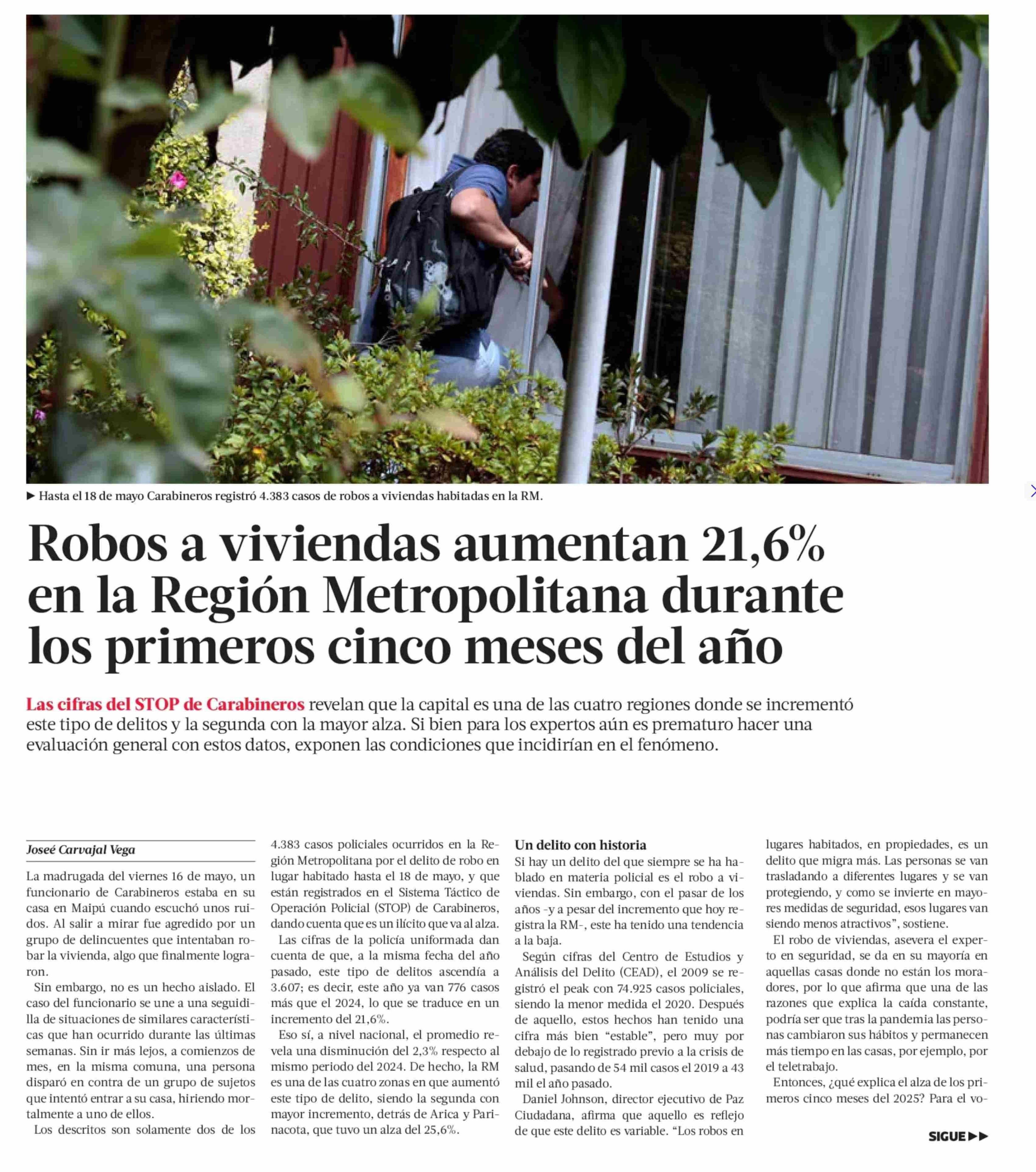 Robos a viviendas aumentan 21,6% en la Región Metropolitana durante los primeros cinco meses del año 26-05-2025 La Tercera |