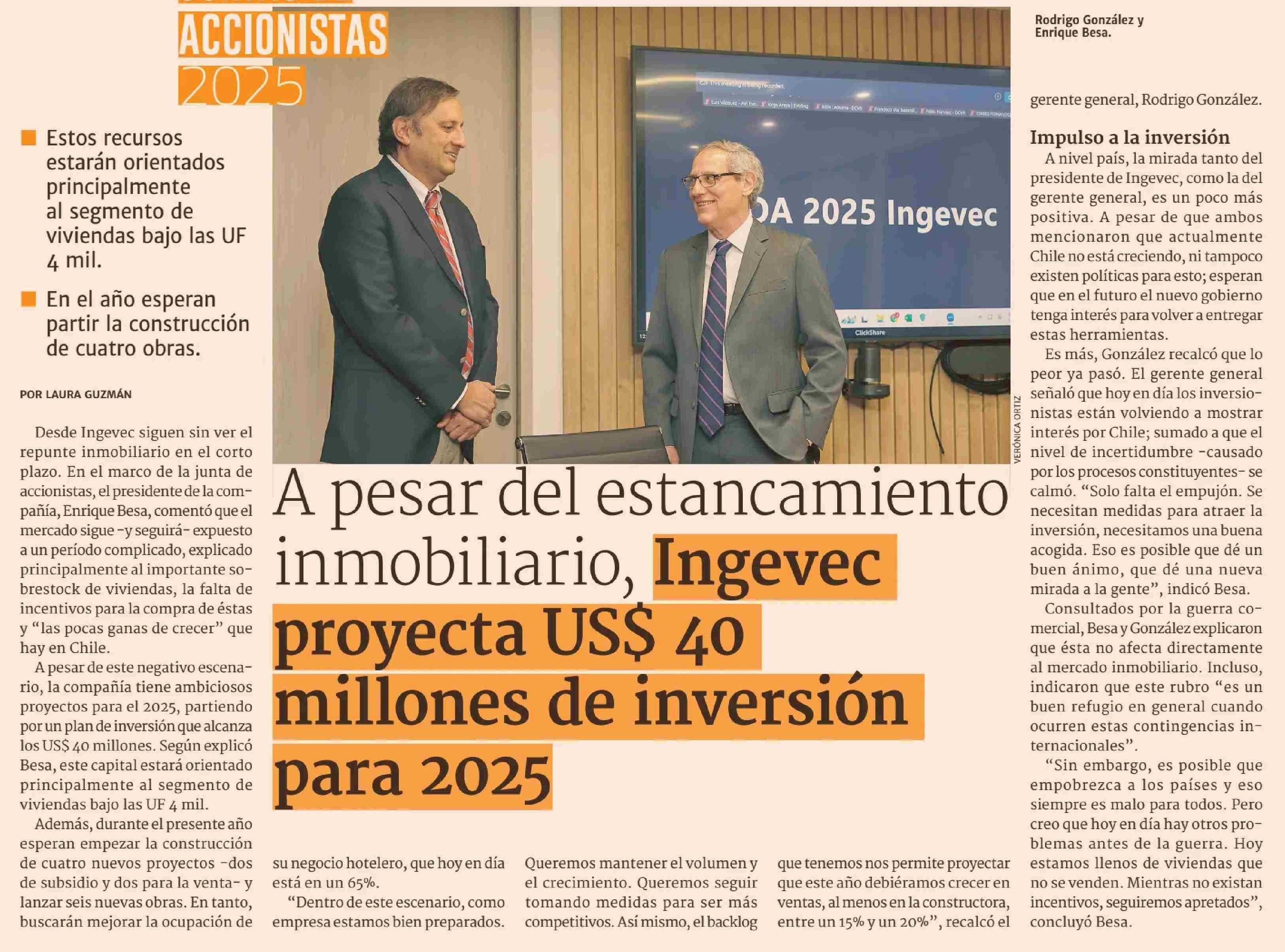 A pesar del estancamiento inmobiliario, Ingevec proyecta US$ 40 millones de inversión para 2025 25-04-2025 Diario Financiero |