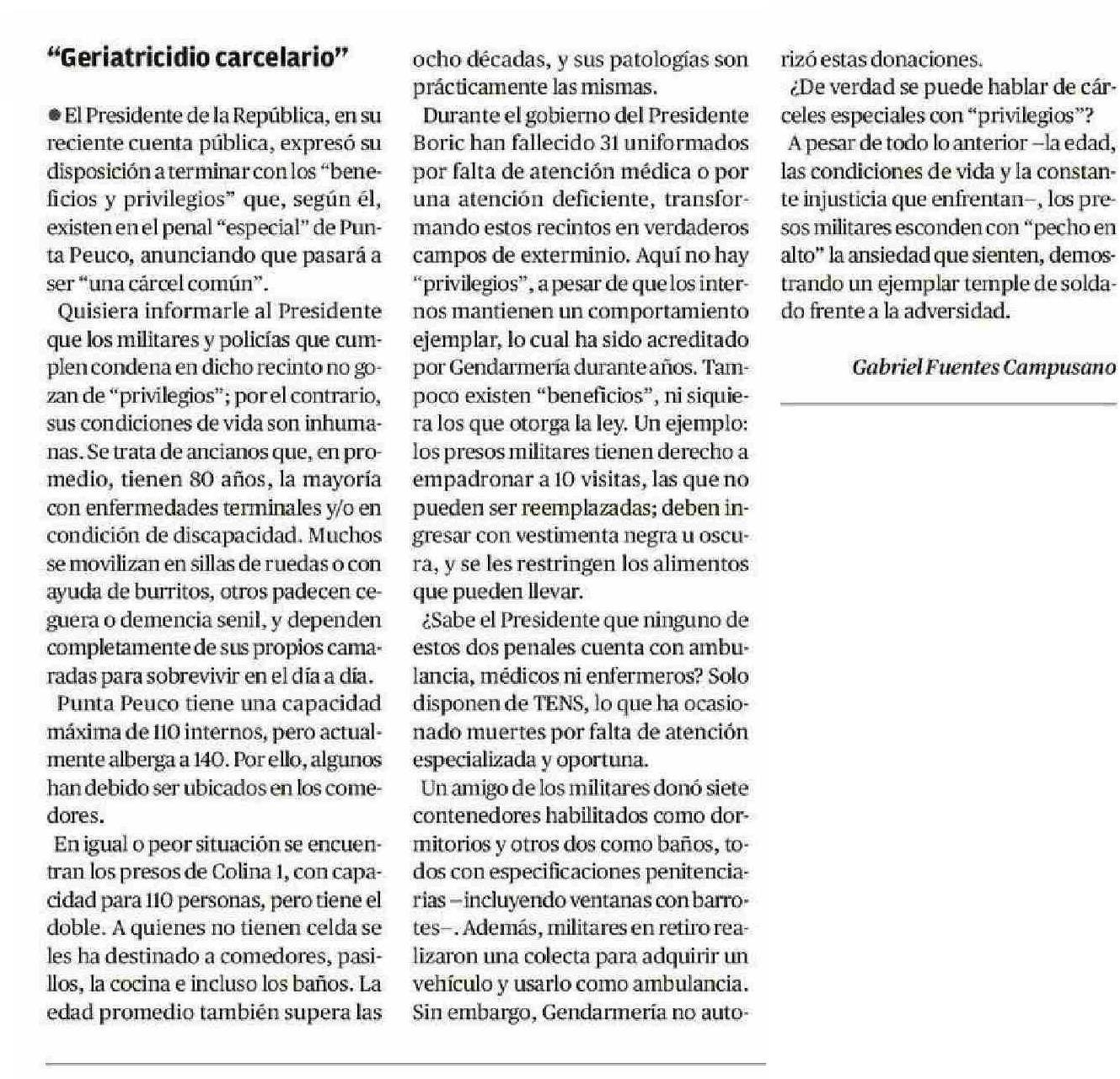 “Geriatricidio carcelario” Gabriel Fuentes Campusano 07-06-2025 El Austral de la Araucanía |