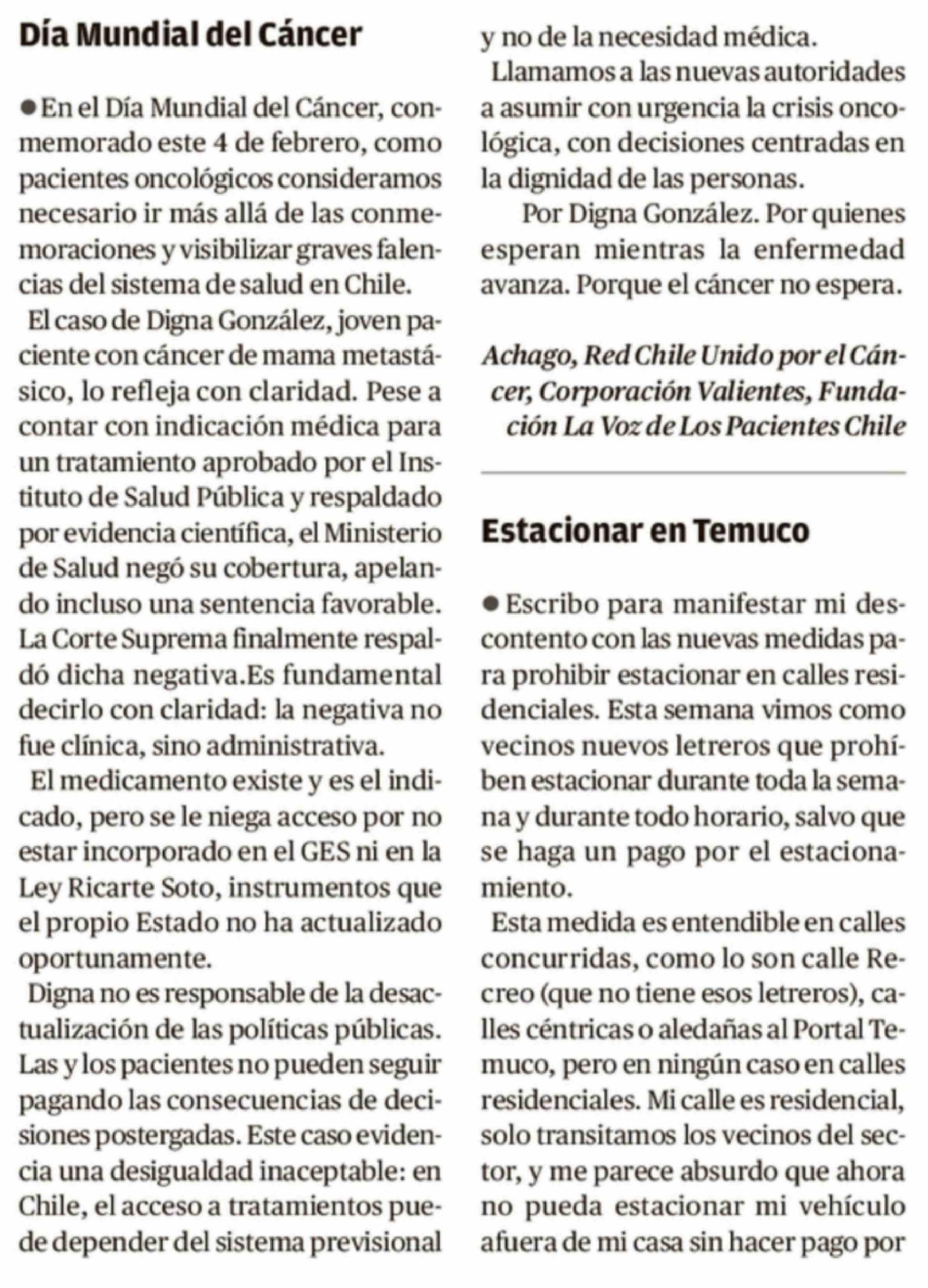 Cartas: Día Mundial del Cancer 11-02-2026 El Austral de la Araucanía |